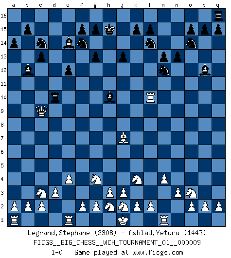 Last move : 1-0 2016 July 16 18:56:26 [Event "FICGS__BIG_CHESS__WCH_TOURNAMENT_01__000009"] [Site "FICGS"] [Date "2016.03.02"] [Round "1"] [White "Legrand,Stephane"] [Black "Aahlad,Yeturu"] [Result "1-0"] [WhiteElo "2308"] [BlackElo "1447"] 1.m2-m4 m15-m13 2.p1-o3 e15-e13 3.b1-c3 j15-k13 4.e2-e4 f16-b12 5.j2-k4 c15-c13 6.l1-p5 h16-o10 7.h2-g4 l16-p12 8.f1-b5 d15-d13 9.k1-h2 c16-l8 10.h1-l4 a15-a14 11.g1-j2 e16-e14 12.d2-d3 n15-n13 13.c1-j7 o16-f8 14.n2-n3 m16-m14 15.o1-m3 h15-g13 16.l4-d11 e13-e12 17.d11-d13 b16-c14 18.d13-b11 a16-d16 19.b11-b9 p16-o14 20.b9-j9 o10-j10 21.j9-k8 d16-d9 22.m3-f9 k13-m12 23.p5-g13 h14-g13 24.f9-h11 j10-l10 25.h11-e14 l8-e14 26.m1-m3 m14-l14 27.b5-l14 k16-l14 28.q1-m1 f8-h10 29.k8-c8 d9-d13 30.c8-c7 j14-j13 31.c7-c10 g16-f14 32.m3-l3 d13-d10 33.c10-c9 j16-h15 34.l3-l10 1-0 Follow this game move after move (download)In life, as in Chess, one's own Pawns block one's way. A man's very wealth, ease, leisure, children, books, which should help him to win, more often checkmate him. (Charles Buxton) Im Internet Chess Club betrug mein Rating vorübergehend 3350 ELO-Punkte. (Sergej Karjakin) El Ajedrez expande y enriquece tu mente. (Saudin Robovic) La vie est comme un jeu d'échecs : nous esquissons un plan, mais celui-ci est tributaire de ce que daignent faire l'adversaire aux échecs et le destin dans la vie. (Arthur Schopenhauer) All battles are fought by scared men who'd rather be someplace else. (John Wayne in the movie In harm's way)