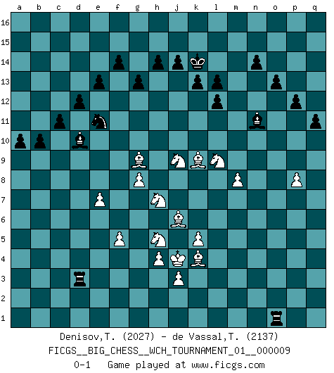 Last move : 0-1 2017 May 14 22:58:48 [Event "FICGS__BIG_CHESS__WCH_TOURNAMENT_01__000009"] [Site "FICGS"] [Date "2016.03.02"] [Round "1"] [White "Denisov,Timofey"] [Black "de Vassal,Thibault"] [Result "0-1"] [WhiteElo "2027"] [BlackElo "2137"] 1.j2-h4 h15-g13 2.d2-d4 j15-k13 3.h1-k3 e15-e13 4.c1-k8 b16-c14 5.n2-n4 f16-b12 6.o1-g8 m15-m13 7.p1-n2 h16-o10 8.q1-o1 o10-b10 9.b2-b3 b10-d8 10.k3-c10 k16-h15 11.c10-c4 p16-o14 12.b1-c3 l16-p12 13.n2-l3 d15-d14 14.c4-d5 d8-c8 15.c3-e4 c16-h11 16.e4-g5 c8-c2 17.g5-h7 c2-c6 18.d5-c6 h11-c6 19.a1-c1 c6-j12 20.g1-j2 n15-n14 21.c1-c9 e16-e14 22.e2-e3 e14-f14 23.f2-f4 o16-e7 24.c9-p9 e7-b4 25.e1-b1 j12-l10 26.f1-d3 g13-h11 27.d3-g6 a15-a13 28.l3-k5 h15-g13 29.k5-j7 q15-q13 30.b1-g1 o14-n12 31.k2-k4 g16-j15 32.l1-k2 j15-h13 33.p9-o9 o15-o14 34.k1-l3 c14-d12 35.l3-j4 m16-m14 36.j7-h9 m14-l14 37.p2-p4 l14-l11 38.k2-m4 q16-m16 39.m4-h8 l11-p11 40.q2-q3 p11-q11 41.g1-c1 c15-c13 42.o9-l9 l10-j8 43.j4-h6 j8-n4 44.o2-o3 n4-p6 45.g6-j4 q11-q3 46.c1-c6 h13-k12 47.h6-f7 p6-m9 48.c6-b6 b4-a5 49.b6-m6 m9-k7 50.j4-m7 k7-o3 51.p4-p5 o3-m1 52.m7-q3 m1-q5 53.p5-p6 a5-h12 54.l9-l7 q5-n2 55.o1-n1 n2-o3 56.n1-n12 o3-j8 57.n12-n8 j8-l10 58.n8-n9 h12-k14 59.n9-l9 l10-k11 60.f7-g9 j16-j15 61.q3-m7 d12-f11 62.l9-k9 p12-m9 63.g9-h11 g13-h11 64.k9-m9 k11-m9 65.m7-h11 m9-k11 66.h7-j9 k11-l12 67.h11-m7 k12-j10 68.l7-l12 m13-l12 69.m7-j10 m16-m6 70.k8-m6 k14-q8 71.l2-l3 a16-m16 72.m6-o4 k13-m14 73.m2-m4 k15-k13 74.o4-k8 m14-n12 75.k8-l9 g15-g13 76.j9-k7 f11-h10 77.g8-h7 n12-l13 78.l9-k8 l13-j12 79.h2-g4 f14-f11 80.g4-h6 f11-p11 81.h7-l10 p11-p10 82.k7-j9 m16-m8 83.h8-j7 m8-o8 84.j10-m7 p10-n10 85.l10-h7 q13-q12 86.h4-j6 n10-n2 87.h6-k7 q8-o10 88.j1-h2 n2-p2 89.h7-l10 o8-o2 90.l10-o7 o2-l2 91.h3-h4 l2-l3 92.g2-g4 l3-l1 93.j6-h8 l1-a1 94.a2-a4 a1-a3 95.e3-e4 a3-b3 96.k7-l9 b3-b4 97.e4-e5 b4-d4 98.a4-a5 d4-a4 99.m7-c16 b15-b14 100.c16-l8 a4-a5 101.h2-h3 l15-l13 102.g4-g5 b12-d10 103.l8-k7 p2-m2 104.p6-p7 b14-b13 105.o7-l4 b13-b12 106.g5-g6 a13-a12 107.l4-h7 a5-a3 108.j2-g3 d10-a7 109.h9-g7 m2-c2 110.g7-h5 a12-a11 111.m4-m5 b12-b11 112.g6-g7 c2-c3 113.h3-j4 f15-f14 114.g3-e4 c3-c1 115.e4-f6 o10-n11 116.g7-g8 h10-g12 117.h7-j6 p15-p13 118.f6-h7 o14-o13 119.m5-m6 p13-p12 120.p7-p8 b11-b10 121.k8-l7 q12-q11 122.m6-m7 j12-l11 123.l7-n9 l11-n12 124.n9-j5 c13-c12 125.j5-f8 a3-d3 126.m7-m8 c12-c11 127.k4-k5 d14-d13 128.k7-j8 n12-l11 129.e5-e6 d13-d12 130.e6-e7 a11-a10 131.f4-f5 c1-o1 132.h8-k9 l11-k9 133.j8-k9 g12-e11 134.j7-g9 j15-k14 135.f8-k4 a7-d10 0-1 Follow this game move after move (download)We must make sure that Chess will not be like a dead language, very interesting, but for a very small group. (Sytze Faber) Ja, jede Frau in Holland liebt mich bestimmt, und alle Männer hassen mich. (Loek van Wely) Bobby es el jugador de Ajedrez mas fino que este país jamás haya producido. Su memoria para las movidas, su brillantez en soñar combinaciones y su feróz determinación por la victoria son algo extraño. (John Collins) On peut tirer plus d'utilité d'une partie perdue que de 100 parties gagnées. (Capablanca) They misunderestimated me. (George W. Bush, Bentonville nov. 6, 2000)