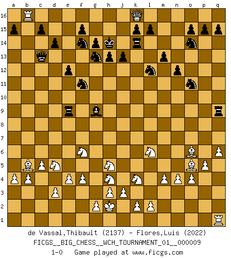 Last move : 1-0 2016 August 4 20:35:53 [Event "FICGS__BIG_CHESS__WCH_TOURNAMENT_01__000009"] [Site "FICGS"] [Date "2016.03.02"] [Round "1"] [White "de Vassal,Thibault"] [Black "Flores,Luis"] [Result "1-0"] [WhiteElo "2137"] [BlackElo "2022"] 1.j2-k4 h15-g13 2.h2-g4 j15-k13 3.e2-e4 p16-o14 4.m2-m4 m15-m13 5.p1-o3 e15-e13 6.l1-p5 b16-c14 7.b1-c3 f16-b12 8.h1-q9 l16-p12 9.p2-p3 d15-d14 10.o1-p2 n15-n13 11.o3-n5 o16-f8 12.g1-j2 k16-l14 13.f1-b5 c16-l8 14.k1-h2 g16-f14 15.q2-q4 q16-n16 16.b2-b4 e13-e12 17.a2-a4 h16-l13 18.c3-d5 e16-e13 19.c1-b2 a16-e16 20.d2-d3 e13-c13 21.c2-c4 f8-g7 22.b2-g7 b12-g7 23.a1-a2 e16-e13 24.e1-e3 e13-f13 25.e3-f3 f13-f3 26.h2-f3 l13-d6 27.j2-g3 d6-d12 28.g3-h5 g7-b12 29.g4-f6 d12-c12 30.q9-l4 c12-b11 31.l4-k5 b11-g11 32.j1-h2 n13-n12 33.a2-e2 n16-n13 34.m1-m3 n13-o13 35.o2-o4 l14-m12 36.f3-h4 m16-m14 37.e2-e3 m14-k14 38.n2-n3 c13-f13 39.e3-g3 g11-f12 40.m3-l3 f12-a7 41.c4-c5 a7-a9 42.f2-f4 k13-m14 43.k5-n8 l8-m9 44.n8-m7 a9-e13 45.p2-q3 m9-l8 46.l3-l8 p12-l8 47.m7-l8 f13-f8 48.l8-c16 j16-h15 49.c16-b15 e13-c13 50.b15-a14 o13-o8 51.a14-h7 f8-h8 52.h7-l7 h8-k8 53.n5-l6 k8-k7 54.l7-j9 m12-o11 55.n3-n4 o8-p8 56.q3-n6 p8-p9 57.j9-m6 b12-d10 58.n6-l8 k7-p7 59.p5-o6 p7-p6 60.l8-o5 p6-q6 61.m6-o8 q6-q9 62.p3-p4 p9-o9 63.o8-m6 o9-m9 64.m6-n6 g15-g14 65.q4-q5 c14-e13 66.q5-q6 d10-e11 67.p4-p5 m14-l12 68.g3-g8 e13-f11 69.n6-c16 m9-g9 70.g8-e8 g9-e9 71.e8-f8 e11-g9 72.f8-b8 h14-h13 73.b8-b16 j14-j13 74.c16-j16 h15-h14 75.j16-k16 1-0 Follow this game move after move (download)Whoever sees no other aim in the game than that of giving checkmate to one's opponent will never become a good Chess player. (Euwe) Heutzutage gewinnt im Turnier nicht derjenige Spieler, der weitreichende Pläne entwirft, sondern einfach jener, der Zug um Zug kämpft. (David Bronstein) Si el ingenio solamente fuese necesario para lucirse, las mujeres serían las mejores jugadoras de Ajedrez del mundo. (Albin) Vous m'avez demandé de vous exposer quel est le fondement de la prière. Je ne fais que préparer les pièces du jeu sur la table... Nous sera-t-il permis d'en adopter les règles et si nous les appliquons scrupuleusement nous ne tarderons pas à faire mat le Roi divin ! Il ne pourra échapper à nos mains. (Sainte Thérèse d'Avila, Chemin de perfection) Depression is just anger without enthusiasm. (Unknown)