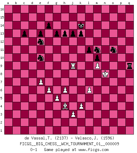 Last move : 0-1 2016 November 7 20:33:18 [Event "FICGS__BIG_CHESS__WCH_TOURNAMENT_01__000009"] [Site "FICGS"] [Date "2016.03.02"] [Round "1"] [White "de Vassal,Thibault"] [Black "Velasco,Jose Maria"] [Result "0-1"] [WhiteElo "2137"] [BlackElo "1596"] 1.j2-k4 m15-m13 2.h1-o7 h15-g13 3.h2-g4 n15-n13 4.o7-o15 j15-k13 5.o15-o9 e15-e13 6.e2-e4 o16-f8 7.o9-p8 f8-o16 8.f1-c4 d15-d13 9.p8-p13 p16-o14 10.p13-n13 h16-o10 11.m2-m4 l16-p12 12.k1-h2 c16-l8 13.n13-j9 o16-h10 14.j9-b9 k16-h15 15.b9-b15 b16-d15 16.b15-d13 d15-f14 17.d13-o3 o10-k10 18.d2-d3 f16-b12 19.g1-j2 q16-o16 20.o3-j8 m16-n16 21.p1-o3 h10-f8 22.l1-p5 k10-c10 23.n2-n3 l15-l14 24.o1-g8 n16-n12 25.j8-j4 c10-o10 26.b1-c3 n12-j12 27.j4-k5 e16-d16 28.c1-l9 d16-d12 29.m1-m3 j12-k12 30.k5-n5 d12-j12 31.j1-h1 b12-c11 32.e1-e3 o16-n16 33.n5-o6 o10-h10 34.h1-g1 a16-b16 35.c4-b5 j12-g12 36.b5-f9 h10-h8 37.o6-e6 n16-n6 38.e6-f7 k12-k7 39.f7-c4 b16-b4 40.c4-d5 b4-b2 41.e4-e5 b2-c2 42.d5-b3 c2-c3 43.b3-c3 g12-g8 44.f9-g8 h8-g8 45.e3-g3 g8-l12 46.m3-l3 k7-k9 47.l9-n7 k9-a9 48.a2-a3 n6-b6 49.d3-d4 a9-b9 50.g4-e3 b6-b1 51.a1-b1 b9-b1 52.h2-f1 l12-a2 53.e3-g4 l8-j10 54.g3-e3 c11-a13 55.c3-a5 f8-e9 56.a5-a12 j10-c4 57.j2-g3 a2-a1 58.g4-h2 a1-d4 59.a12-a4 d4-d5 60.h2-f3 c4-b5 61.a4-c2 b1-a1 62.c2-e4 d5-e6 63.f3-d4 e6-e8 64.d4-b5 e8-b5 65.e4-d3 b5-f9 66.d3-c3 a1-a2 67.e3-f3 p12-f3 68.c3-f3 f9-a4 69.n7-l9 a2-a3 70.f3-e4 a4-a6 71.l3-l6 a6-b5 72.l9-e3 b5-g10 73.l6-g6 g10-e10 74.e4-b4 e9-f8 75.e3-c5 f8-c5 76.b4-c5 a3-a1 77.c5-o16 j16-j15 78.o16-p15 o14-n12 79.e5-e6 e10-a6 80.p15-q15 a13-j5 81.k4-h5 a6-c4 82.q15-q8 m13-m12 83.q8-n5 j5-g3 84.h5-g3 c4-c2 85.n5-f5 a1-f1 86.g1-h2 c2-f5 87.g3-f5 f1-q1 88.p5-q4 q1-a1 89.f5-g3 a1-a6 90.f2-f4 f14-e12 91.f4-f5 f15-f14 92.g6-n6 k13-l11 93.n6-g6 a6-a10 94.p2-p4 a15-a13 95.o3-n5 a10-q10 96.q4-p3 a13-a12 97.g6-g8 q10-a10 98.g8-c8 c15-c13 99.q2-q4 g13-f11 100.q4-q5 g16-e15 101.o2-o4 h15-j13 102.o4-o5 e15-c14 103.c8-c2 a12-a11 104.h2-j2 a10-a5 105.q5-q6 a11-a10 106.p4-p5 f11-d10 107.p5-p6 d10-e8 108.q6-q7 a5-a3 109.g3-e4 a3-e3 110.e4-c5 e8-f6 111.n5-m7 f6-e4 112.c5-e4 e3-e4 113.j2-k3 e4-d4 114.p6-p7 d4-d10 115.l2-l4 c14-d12 116.c2-c12 d10-c10 117.c12-a12 c10-c7 118.m7-o6 c7-p7 119.p3-n5 p7-p10 120.g2-g4 n12-p11 121.g4-g5 p11-o9 122.f5-f6 o9-n7 123.o6-p8 n7-p8 124.q7-p8 l11-m9 125.o5-o6 m9-o8 126.o6-o7 j13-g12 127.n3-n4 o8-n6 128.n5-o6 p10-o10 129.o6-q8 o10-m10 130.k3-l3 n6-p5 131.o7-o8 p5-n4 132.l3-m3 n4-l5 133.m3-n3 l5-k3 134.h3-h4 l14-l13 135.a12-a11 g12-j13 136.p8-p9 m10-n10 137.n3-m3 d12-b13 138.a11-e11 b13-c11 139.e11-e9 n10-n8 140.e9-o9 k3-l1 141.m3-l2 l1-n2 142.p9-p10 n2-o4 143.p10-p11 o4-p6 144.q8-p9 j13-l14 145.p11-p12 n8-n14 146.p12-p13 n14-p14 147.o9-o13 j15-k14 148.l2-m3 a10-a9 149.o13-o9 p14-p13 150.o9-a9 p13-o13 151.o8-o9 o13-p13 152.p9-m6 p6-q8 153.o9-o10 q8-o7 154.m6-l7 p13-p9 155.a9-a8 p9-o9 156.a8-p8 g15-g13 157.l4-l5 l14-n13 158.k2-k4 o7-n9 159.p8-h8 h14-h13 160.h8-k8 k14-l14 161.k8-k9 n13-o11 162.m3-n4 c11-e10 163.m4-m5 m12-m11 164.m5-m6 m11-m10 165.m6-m7 o9-q9 166.m7-m8 q9-q4 167.n4-o5 n9-m11 168.h4-h5 q4-q3 169.l7-h4 q3-o3 170.o5-n6 o3-o10 171.m8-m9 o10-o9 172.n6-n7 k15-k13 173.n7-n8 o9-q9 174.k9-j9 l14-k14 175.e6-e7 j14-j13 176.h5-h6 l13-l12 177.l5-l6 l12-l11 0-1 Follow this game move after move (download)Chess is a beautiful mistress. (Bent Larsen) Man gibt nur Pakete auf. (Paul Keres) Cuando la partida de Ajedrez termina, el Peón y el Rey regresan a la misma caja. (Irish saying) Il a essayé de se convaincre qu'il pourrait empêcher toutes les erreurs et ne jamais perdre. L'horreur ! Gary Kasparov au sujet de Robert Fischer. He who fights with monsters should be careful lest he thereby become a monster. (Friedrich Nietzsche, Beyond Good and Evil)
