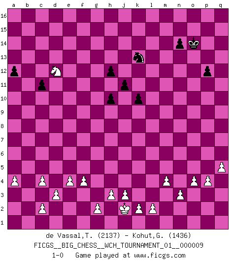 Last move : 1-0 2017 March 27 19:40:21 [Event "FICGS__BIG_CHESS__WCH_TOURNAMENT_01__000009"] [Site "FICGS"] [Date "2016.03.02"] [Round "1"] [White "de Vassal,Thibault"] [Black "Kohut,Gregory"] [Result "1-0"] [WhiteElo "2137"] [BlackElo "1436"] 1.j2-k4 p16-o14 2.h2-g4 h15-g13 3.e2-e4 j15-k13 4.m2-m4 e15-e13 5.h1-p8 p15-p14 6.f1-b5 g16-j15 7.b1-c3 o16-p15 8.p1-o3 m15-m14 9.l1-p5 f16-e15 10.d2-d3 b16-c14 11.c1-l9 k16-h15 12.n2-n3 d15-d14 13.o1-f9 l15-l14 14.k1-h2 l16-n14 15.g1-j2 f15-f13 16.m1-m3 f13-f12 17.m3-l3 c14-d12 18.e1-e3 c16-j10 19.e3-f3 m16-l16 20.l3-l5 j15-h13 21.l5-j5 j10-l12 22.p8-o7 o14-m15 23.o7-h13 m15-l13 24.h13-b7 b15-b14 25.j2-h4 e16-f16 26.q1-m1 a16-e16 27.f3-f5 d12-e14 28.f5-h5 h16-k14 29.b7-a8 a15-a13 30.f9-c12 e15-d16 31.c12-b13 j16-j15 32.b13-e16 f16-e16 33.a1-e1 k14-l15 34.e1-e3 l15-k16 35.e3-f3 k16-f16 36.j1-j2 f16-f15 37.h2-k3 p15-c3 38.b2-c3 e16-f16 39.a2-a4 f15-f13 40.a8-f13 f16-f13 41.c3-c4 f13-f16 42.m1-m3 g13-f15 43.l9-d16 f15-d16 44.q2-q4 l16-g16 45.o3-n5 q16-k16 46.m3-l3 j15-k14 47.l3-l7 k14-l15 48.f3-f6 k16-j16 49.p2-p4 d16-b15 50.k3-l5 j16-h16 51.l5-j6 b15-c13 52.j6-h8 l15-m15 53.f6-m6 g15-g13 54.j5-l5 l12-m13 55.h8-k9 h14-h13 56.l7-m7 g13-g12 57.k9-l11 k13-l11 58.l5-l11 h15-g13 59.l11-l13 m14-l13 60.m7-m13 n14-m13 61.m6-m13 m15-n16 62.h5-m5 h16-m16 63.p5-h12 m16-m13 64.m5-m13 l13-l12 65.m13-l13 g13-j12 66.l13-l12 j12-g13 67.o2-o4 g16-l16 68.g4-f6 g13-f11 69.h12-k14 f11-g13 70.f2-f4 g13-h15 71.k14-c7 f16-g16 72.f6-g8 g16-e16 73.l12-k12 k15-k13 74.k12-k6 h15-g13 75.g8-h10 e16-e15 76.k6-m6 e15-h15 77.h10-k11 g13-j12 78.k11-j13 h15-f15 79.h4-j6 e14-g13 80.j13-k11 l14-l13 81.j6-k8 l13-l12 82.k11-m10 l16-j16 83.m10-n12 c13-e14 84.m6-n6 n16-o16 85.n6-o6 n15-n14 86.n12-p13 o16-p15 87.k8-l10 q15-q14 88.p13-o11 f15-d15 89.o11-n13 d15-e15 90.k4-l6 j16-l16 91.c7-e5 l12-l11 92.l6-m8 j14-j13 93.l10-j11 l16-l13 94.o6-n6 e15-h15 95.m8-l10 k13-k12 96.j11-k9 p15-p16 97.q4-q5 p16-o16 98.k9-l11 l13-l11 99.e5-l11 j12-l11 100.n6-m6 g13-h11 101.b5-h11 g12-h11 102.m6-m15 h15-m15 103.n13-m15 o16-n15 104.m15-n13 k12-k11 105.l10-j11 h13-h12 106.j11-g12 j13-j12 107.n5-m7 e14-g13 108.m7-l9 k11-k10 109.l9-j8 j12-j11 110.j8-g9 h11-h10 111.g9-e10 l11-k13 112.e10-c11 c15-c14 113.c11-a12 b14-b13 114.a12-b14 g13-f15 115.b14-c16 d14-d13 116.c16-e15 f15-d16 117.g12-e13 c14-c13 118.e15-d13 p14-p13 119.d13-c15 b13-b12 120.e13-d11 c13-c12 121.d11-f12 o15-o13 122.c15-e14 d16-e14 123.f12-e14 p13-p12 124.e14-d12 b12-b11 125.d12-f11 n15-m14 126.n13-o15 m14-n15 127.o15-q14 n15-o14 128.q14-p12 o13-p12 129.f11-d10 c12-c11 130.d10-b11 a13-a12 131.b11-d12 1-0 Follow this game move after move (download)Chess is a foolish expedient for making idle people believe they are doing something very clever when they are only wasting their time. (George Bernard Shaw) Versuche, dich von der Sklaverei der Eröffnungsvarianten zu befreien. Stattdessen soll man gewisse Typenpositionen erlernen, die man eingehend analysiert. (Aaron Nimzowitsch) En el Ajedrez, tal como en la vida, las bendiciones de hoy pueden ser el veneno del mañana. (Assaic) Le pion, dans sa simplicité, marche droit devant lui, mais lorsqu'il prend, il le fait obliquement? Ainsi l'homme, tant qu'il reste pauvre, marche dans la droiture et vit honnêtement, mais lorsqu'il recherche les honneurs, il flatte, se parjure et, par les voies obliques, cherche une position supérieure sur l'échiquier du monde. (Jean de Galles) The Internet is so big, so powerful and pointless that for some people it is a complete substitute for life. (Andrew Brown)
