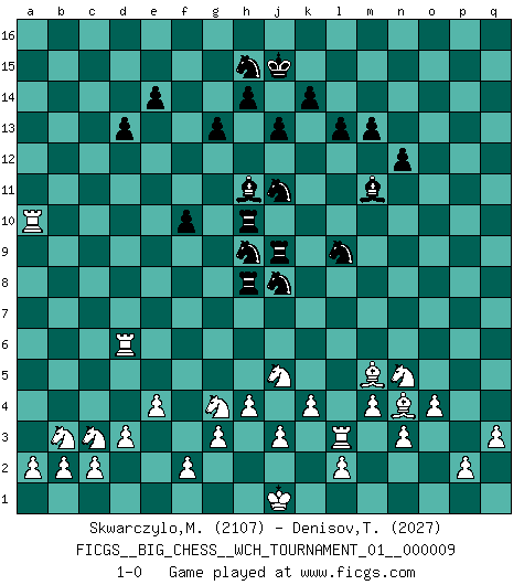 Last move : 1-0 2016 December 13 17:43:59 [Event "FICGS__BIG_CHESS__WCH_TOURNAMENT_01__000009"] [Site "FICGS"] [Date "2016.03.02"] [Round "1"] [White "Skwarczylo,Marek"] [Black "Denisov,Timofey"] [Result "1-0"] [WhiteElo "2107"] [BlackElo "2027"] 1.j2-k4 n15-n14 2.h1-o7 j15-h13 3.o7-c7 h16-k14 4.c7-c15 k14-f10 5.c15-l7 o16-h10 6.l7-o10 d15-d13 7.g1-f3 p16-o14 8.m2-m4 f10-g11 9.g2-g3 c16-h11 10.p1-o3 g16-j15 11.b1-c3 b16-d15 12.l1-p5 j14-j13 13.n2-n3 a16-c16 14.d2-d3 c16-c8 15.o10-p11 k16-j14 16.p11-p15 h10-j9 17.p15-q14 q16-p16 18.c1-d2 p16-p10 19.h3-h4 p10-b10 20.a1-b1 m15-m13 21.f1-h3 c8-j8 22.h3-l6 j8-e8 23.q14-g5 b10-d10 24.g5-g11 h13-g11 25.h2-k3 g11-j10 26.c3-e4 d15-e13 27.d2-c3 j9-c3 28.e4-c3 o14-n12 29.k1-h2 n12-m10 30.o1-h7 j10-k8 31.h7-b13 e16-c16 32.l6-j4 e8-j8 33.m1-m3 c16-c8 34.f3-d2 m10-l8 35.m3-l3 d10-h10 36.b13-m3 e15-e14 37.j4-h5 f16-b12 38.k3-j5 l8-k10 39.l3-l9 b12-h6 40.d2-b3 k8-h9 41.l9-l10 e13-g12 42.h2-g4 h6-j7 43.m3-n4 j8-j12 44.l10-q10 f15-f13 45.q10-q15 k15-k14 46.q15-o15 g12-f10 47.o3-n5 h9-g7 48.h5-k3 g7-j8 49.o15-o8 j7-m10 50.o8-p8 j14-h12 51.o2-o4 f10-h9 52.k4-l6 l16-j14 53.p8-n8 m16-m14 54.q1-m1 h12-k11 55.m1-m3 k11-l9 56.n8-q8 m10-n11 57.q8-q16 j16-k15 58.q16-e16 f13-f12 59.e16-e15 g15-g14 60.e15-b15 a15-a13 61.m3-l3 j12-j9 62.b15-b9 c8-h8 63.l6-k8 n11-m10 64.k8-h9 k10-h9 65.b9-a9 f12-f11 66.a9-a13 j15-k13 67.e2-e4 k13-j11 68.e1-e3 f11-f10 69.e3-f3 n14-n13 70.b1-e1 m14-q14 71.q2-q3 q14-q8 72.a13-a10 g14-g13 73.f3-f6 l15-l13 74.e1-e3 q8-k8 75.e3-f3 n13-n12 76.p5-n7 m10-o8 77.n7-o8 k8-o8 78.f6-d6 k15-j15 79.k3-m5 j14-n10 80.f3-f6 o8-m8 81.f6-m6 m8-m11 82.m6-m11 n10-m11 83.k2-k4 1-0 Follow this game move after move (download)The King is a fighting piece. Use it ! (Wilhelm Steinitz) Ein Teil des Fehlers ist immer korrekt. (Savielly Grigorievitsch Tartakower) Dejen al perfeccionista jugar por correo. (Yasser Seirawan) Les Echecs représentent une sphère d'idées créatrices basée sur la volonté des deux protagonistes. (Smyslov) The ego is not master in its own house. (Sigmund Freud)