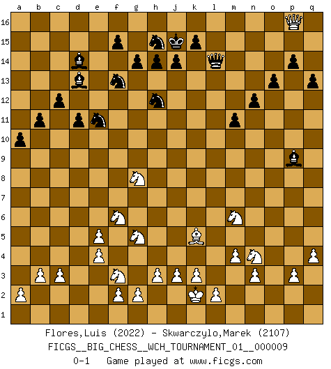 Last move : 0-1 2016 September 11 20:31:59 [Event "FICGS__BIG_CHESS__WCH_TOURNAMENT_01__000009"] [Site "FICGS"] [Date "2016.03.02"] [Round "1"] [White "Flores,Luis"] [Black "Skwarczylo,Marek"] [Result "0-1"] [WhiteElo "2022"] [BlackElo "2107"] 1.j2-k4 h15-g13 2.b1-c3 j15-k13 3.e2-e4 h16-o10 4.h2-g4 o10-o2 5.p1-o3 o2-f10 6.g1-f3 p16-o14 7.m2-m4 b16-c14 8.f1-c4 m15-m13 9.l1-o4 l16-p12 10.d2-d4 n15-n14 11.c4-b3 e15-e13 12.c1-k8 f16-b12 13.n2-n3 d15-d14 14.o1-g8 o16-f8 15.a1-d1 c16-l8 16.k1-h2 k16-h15 17.h1-l4 m16-m14 18.k8-g11 f10-p10 19.o3-p5 m14-l14 20.l4-h7 g16-j15 21.p2-p3 e16-e14 22.g8-h9 j15-h13 23.g11-j9 h13-j11 24.h9-j8 e14-f14 25.q2-q4 g13-h11 26.h7-b13 c14-a13 27.j9-e5 h11-g9 28.j8-l6 p10-p6 29.l6-n4 p6-q6 30.c3-d5 c15-c14 31.b13-k5 q6-j13 32.j1-h1 q16-m16 33.d5-f6 a16-e16 34.f6-d7 f8-d10 35.d1-d3 j13-a5 36.h1-j2 g9-f7 37.k5-k12 f7-e5 38.d4-e5 p12-q13 39.e1-d1 a5-j13 40.k12-e12 j11-k9 41.k4-m5 l8-p4 42.m1-e1 d14-d13 43.e12-q12 h15-g13 44.m5-o6 p4-l8 45.d7-f6 d10-c11 46.q12-p13 q13-p14 47.d3-d8 l8-q13 48.d1-d3 f14-f8 49.e1-d1 l14-l8 50.d8-f8 l8-f8 51.d3-d9 q15-q14 52.p13-n13 j13-l11 53.n13-n6 q13-l8 54.n6-k6 l11-h8 55.k6-k5 a13-c12 56.d1-d2 k13-j11 57.q1-d1 c12-e11 58.d9-d8 l8-p12 59.d8-f8 h8-f8 60.d2-d8 f8-f9 61.k5-l5 d13-d12 62.d8-a8 a15-a13 63.l5-l15 c11-e9 64.l15-l6 j16-j15 65.n4-m3 f9-j12 66.l6-n6 e16-e14 67.b3-j10 e14-f14 68.o4-e13 f14-f10 69.j10-b3 j12-e12 70.n6-n11 m13-m12 71.n11-k8 j11-l10 72.k8-k9 e12-a8 73.e13-g11 f10-k10 74.k9-k10 e9-g11 75.o6-n4 c14-c13 76.k10-e10 a8-e12 77.e10-b13 e12-e15 78.b13-g8 g11-k14 79.g8-g9 e15-e14 80.m3-n2 b15-b14 81.d1-d7 e14-g12 82.g9-h8 m16-l16 83.h2-j4 p12-l8 84.j4-k6 l8-o5 85.n2-m3 l16-l11 86.h8-h10 k14-l13 87.h10-b16 g12-e14 88.k2-k3 l10-j11 89.b16-g16 g15-g14 90.g16-q16 o14-q13 91.q16-b16 j11-g10 92.b16-g16 g10-f8 93.d7-k7 l13-k14 94.b3-g8 e11-f13 95.g8-c12 e14-f14 96.g16-b16 l11-c11 97.c2-c3 f13-e11 98.c12-g8 e11-g10 99.k7-e7 c11-e11 100.e7-k7 g13-h15 101.b16-k8 e11-l11 102.k6-h7 o5-k9 103.h7-g5 l11-l8 104.k8-h10 f14-f12 105.h10-k10 k9-n12 106.k7-e7 g10-e11 107.k10-d16 f12-f14 108.d16-d15 n12-k9 109.g8-j10 k9-j10 110.d15-j10 l8-l10 111.j10-h11 l10-l11 112.h11-d15 l11-l16 113.e7-k7 q13-o14 114.k7-f7 f14-e14 115.d15-c15 e11-f13 116.c15-h10 e14-d14 117.h10-h8 f8-g10 118.h8-h9 g10-e11 119.h9-h8 o14-m13 120.j2-k2 m13-l11 121.f7-k7 p14-o13 122.h8-p8 p15-p14 123.k7-q7 q14-q13 124.q7-k7 a13-a12 125.k7-a7 a12-a11 126.a7-k7 c13-c12 127.k7-b7 b12-c13 128.b7-k7 b14-b13 129.k7-b7 b13-b12 130.b7-k7 d12-d11 131.p8-e8 b12-b11 132.e8-m15 l16-l15 133.m15-m14 l11-k13 134.m14-q10 a11-a10 135.p5-o7 l15-l7 136.q10-k4 l7-k7 137.k4-k7 d14-d13 138.k7-k12 d13-h9 139.b2-b3 h9-l9 140.k12-o16 l9-l15 141.o16-c16 c13-f16 142.o7-m6 o13-j8 143.c16-d16 k14-h12 144.d16-e16 j8-d13 145.e16-e13 h12-g11 146.e13-a9 n14-n13 147.a9-o9 o15-o13 148.o9-p9 l15-l14 149.m3-k5 n13-n12 150.g4-h6 g11-k14 151.h6-g8 m12-m11 152.p9-j9 k14-m12 153.j9-j7 f16-d14 154.j7-j10 k13-h12 155.j10-p16 m12-p9 0-1 Follow this game move after move (download)One doesn't have to play well, it's enough to play better than your opponent. (Siegbert Tarrasch) Das Schach ist nichts für kleine Geister, es beansprucht einen vollen Mann, der sich nicht sklavisch an das Überlieferte hält, sondern selbständig die Tiefen des Spiels zu ergründen sucht. (Wilhelm Steinitz) Me gusta decir que Bobby Fischer fue el mejor jugador que jamás haya existido. Pero lo que hizo de Fischer un genio, fue su habilidad de mezclar una frescura y pragmatismo Americano con ideas Rusas acerca de la estrategia. (Bruce Pandolfini) Les Echecs ont trois composantes : le temps, l'espace et le matériel en dernier. (Mikhail Tal) If you work for a living, why do you kill yourself working ? (Tuco to a chicken in The Good, The Bad and The Ugly)
