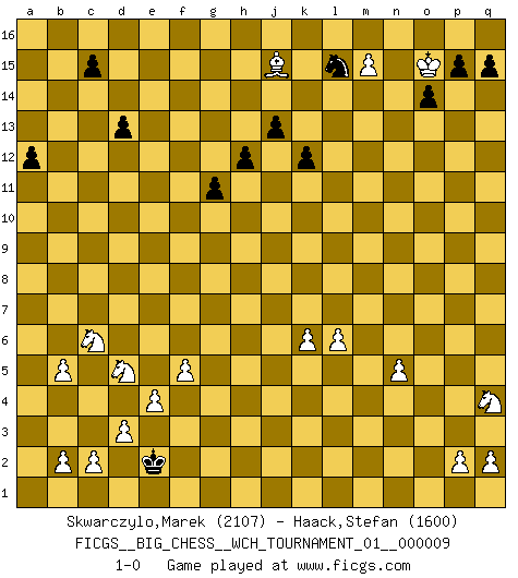 Last move : 1-0 2017 January 25 12:40:6 [Event "FICGS__BIG_CHESS__WCH_TOURNAMENT_01__000009"] [Site "FICGS"] [Date "2016.03.02"] [Round "1"] [White "Skwarczylo,Marek"] [Black "Haack,Stefan"] [Result "1-0"] [WhiteElo "2107"] [BlackElo "1600"] 1.j2-k4 d15-d13 2.h1-o7 p16-o14 3.o7-f15 g16-f14 4.f15-o7 h14-h13 5.o7-c7 b16-c14 6.c7-l15 k16-l14 7.l15-b6 j14-j13 8.p1-o3 k15-k13 9.e2-e4 n15-n13 10.f1-c4 m15-m13 11.b1-c3 g15-g13 12.d2-d3 e15-e13 13.m2-m4 h13-h12 14.l1-o4 o16-j11 15.n2-n3 l16-g12 16.c1-k8 a15-a13 17.o1-g8 l14-k12 18.h2-g4 f16-d14 19.k1-h2 b15-b13 20.b6-b13 c14-d12 21.b13-a12 c16-d15 22.a12-g6 a13-a12 23.g1-j2 g12-j10 24.g8-j10 k12-j10 25.k8-j9 m13-m12 26.g6-p6 q16-p16 27.p6-p10 j16-k16 28.c4-j10 d15-j10 29.p10-j10 m16-m15 30.m1-m3 h16-g15 31.q1-m1 g15-d15 32.j10-d15 f14-d15 33.e1-e3 a16-b16 34.c3-d5 g13-g12 35.a1-e1 h15-g13 36.e3-f3 g13-h11 37.j9-c3 j15-h13 38.m3-l3 m15-l15 39.l3-l15 k16-l15 40.f3-f15 l15-k14 41.f15-d15 e16-e15 42.d15-e15 d14-e15 43.o4-e13 d12-e14 44.e13-o4 e15-b12 45.e1-e3 h11-g9 46.e3-f3 b16-f16 47.m1-m3 f16-f3 48.h2-f3 g9-f7 49.m3-l3 j11-f8 50.l3-l7 f7-g9 51.l7-n7 p16-n16 52.o4-h10 g12-g11 53.h10-m14 b12-d10 54.n7-n13 n16-n13 55.c3-m12 k14-l14 56.m14-n13 h13-j11 57.m12-c3 j11-h9 58.c3-b4 f8-b4 59.d5-b4 g9-f7 60.f3-e5 f7-e5 61.g4-e5 h9-g7 62.j2-h4 g7-e6 63.g2-g3 d10-k4 64.j3-k4 o14-n16 65.j1-j2 o15-o14 66.n13-f6 l14-l13 67.f2-f4 n16-l15 68.f4-f5 e6-c7 69.j2-j3 l15-j14 70.j3-j4 j14-g13 71.l2-l4 e14-d12 72.k4-k5 g13-f11 73.l4-l5 d12-e10 74.m4-m5 c7-b5 75.e5-c6 f11-e9 76.f6-e5 e9-d7 77.e5-f4 l13-l12 78.a2-a4 l12-k11 79.a4-b5 k11-l10 80.b4-d5 l10-m9 81.j4-j5 m9-n8 82.k5-k6 n8-o7 83.l5-l6 o7-o6 84.n3-n4 d7-f8 85.j5-j6 f8-h9 86.f4-l9 o6-p6 87.j6-k7 k13-k12 88.m5-m6 h9-g7 89.m6-m7 g7-h5 90.h4-j2 p6-q5 91.l9-h6 q5-p4 92.k7-j6 h5-g3 93.j2-g3 p4-o4 94.n4-n5 o4-n4 95.m7-m8 n4-m3 96.m8-m9 m3-n2 97.m9-m10 n2-o2 98.o3-q4 o2-n2 99.m10-m11 e10-f12 100.m11-m12 f12-h13 101.m12-m13 h13-k14 102.m13-m14 n2-m3 103.j6-k7 m3-l2 104.k7-l8 l2-k2 105.l8-m9 k2-j3 106.m9-n10 j3-h3 107.n10-m11 h3-g3 108.h6-n11 k14-m15 109.m11-m12 g3-f2 110.m12-m13 f2-e2 111.m13-n14 m15-k16 112.n11-j15 k16-j14 113.m14-m15 j14-l15 114.n14-o15 1-0 This big chess game has been lost on time (started : 2016.03.02 15:44:59) Follow this game move after move (download)It is the aim of the modern school, not to treat every position according to one general law, but according to the principle inherent in the position. (Richard Reti) Ich rechne überhaupt nicht voraus. Ich gewinne auch so. (Robert James Fischer) El Ajedrez es un terrible juego. Si no controlas el centro, tu oponente tiene una posición mas holgada. Si tienes control del centro, ¡entonces realmente tu tienes algo de que preocuparte!. (Siegbert Tarrasch) Psychologiquement, tu dois avoir confiance en toi même, mais cette confiance doit être basée sur des faits. (Robert Fischer) Perhaps chess is the wrong game for the times (The Chess Master and the Computer, by Garry Kasparov - 2010)