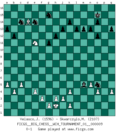 Last move : 0-1 2016 June 30 10:40:13 [Event "FICGS__BIG_CHESS__WCH_TOURNAMENT_01__000009"] [Site "FICGS"] [Date "2016.03.02"] [Round "1"] [White "Velasco,Jose Maria"] [Black "Skwarczylo,Marek"] [Result "0-1"] [WhiteElo "1596"] [BlackElo "2107"] 1.j2-k4 h15-g13 2.n2-n4 p16-o14 3.m2-m4 j15-k13 4.e2-e4 h16-o10 5.h2-g4 b16-c14 6.d2-d4 e15-e13 7.f1-c4 m15-m13 8.p1-o3 f16-b12 9.h1-l4 l16-p12 10.k1-h2 d15-d14 11.g1-j2 n15-n14 12.l1-p5 k16-h15 13.c1-l9 m16-m14 14.b1-c3 m14-l14 15.c4-b5 h15-j13 16.l4-h7 c16-h11 17.b5-c4 o16-f8 18.l9-m8 o10-h10 19.h7-p7 g13-j12 20.o1-g8 g16-j15 21.l2-l3 q16-m16 22.m8-q12 q15-q13 23.p7-o7 j15-h13 24.m4-m5 e16-e14 25.g8-c12 e14-e16 26.c12-f15 e16-f16 27.f15-d13 h10-d10 28.d13-h9 d10-d4 29.a1-d1 d4-h8 30.o3-m4 f16-f9 31.h9-g8 f9-g9 32.o7-f7 f8-k4 33.q12-o14 p15-o14 34.j2-k4 b12-k4 35.l3-k4 p12-h5 36.f7-f8 j16-j15 37.m1-m2 j12-h10 38.d1-d8 h10-g8 39.c4-g8 l14-l8 40.f8-h6 h5-g4 41.h2-g4 g9-g8 42.h6-h8 g8-h8 43.d8-h8 l8-h8 44.e1-d1 a16-f16 45.m2-l2 f16-f8 46.j1-h2 m16-p16 47.o2-o4 h11-l8 48.f2-f3 p16-p10 49.q1-l1 l8-p12 50.d1-d2 f8-b8 51.b2-b3 p10-a10 52.a2-a4 a10-c10 53.c3-b5 b8-d8 54.l1-d1 c10-d10 55.d2-d8 h8-d8 56.d1-c1 d8-d1 57.l2-l1 d1-c1 58.l1-c1 h13-f12 59.g4-e3 j13-h11 60.e3-d5 c14-d12 61.c1-l1 d12-e10 62.l1-l7 d10-c10 63.c2-c4 a15-a13 64.p5-n7 g15-g13 65.m4-n6 k15-k14 66.n6-p7 c10-c8 67.n7-p5 c8-l8 68.l7-o7 o14-o13 69.q2-q4 l8-l2 70.h2-j2 l2-p2 71.p7-o9 p2-l2 72.o7-q7 l2-l11 73.q7-c7 f12-e14 74.b3-b4 h11-f12 75.o9-p7 l11-c11 76.c7-b7 b15-b14 77.c4-c5 j14-j13 78.p7-q9 c11-a11 79.a4-a5 a11-o11 80.b7-b6 e10-d12 81.b6-c6 j15-j14 82.q9-p7 o11-b11 83.b5-a7 b11-b7 84.c6-c7 b7-c7 85.d5-c7 h14-h13 86.c7-d9 g13-g12 87.d9-c11 h13-h12 88.p7-q9 g12-g11 89.q9-o10 p12-n10 90.o10-q11 l15-l13 91.q11-p13 k13-m14 92.p5-n7 n14-n13 93.j2-h2 n10-p12 94.p13-q15 m14-n12 95.q15-o16 o13-o12 96.n7-m8 p12-o13 97.c11-e12 f12-h13 98.m8-j5 j14-k15 99.j5-h4 k15-l15 100.h4-c9 l15-m16 101.c9-k16 o15-o14 102.k16-c9 m16-n15 103.c9-a11 n15-o16 104.a7-c8 o16-o15 105.c8-e7 n12-m10 106.e7-d5 m10-n8 107.n4-n5 o13-j8 108.e12-d14 c15-d14 109.a11-d14 j8-m5 110.d14-e13 b14-b13 111.d5-e7 n8-p7 112.e7-d9 p7-o5 113.e13-b16 d12-c14 114.b16-d14 b13-b12 115.d9-e11 h13-g15 0-1 Follow this game move after move (download)I play correspondence chess because it is both art and science while chess is art only. (A player at FICGS) Ich verstehe mehr vom Schach als irgendein anderer lebender Meister. (José Raúl Capablanca) Aún deseo matar a Fischer. (Boris Spassky) Il vaut toujours mieux jouer un plan faux de façon logique que de n'avoir pas de plan du tout. (Victor Kortchnoï) Imagination is more important than knowledge. Knowledge is limited. Imagination encircles the world. (Albert Einstein)