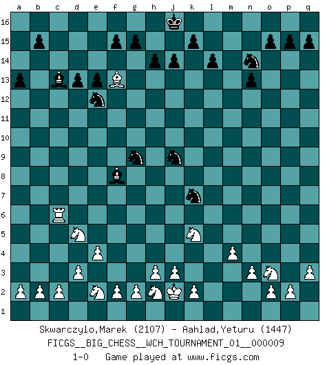 Last move : 1-0 2016 September 9 18:50:44 [Event "FICGS__BIG_CHESS__WCH_TOURNAMENT_01__000009"] [Site "FICGS"] [Date "2016.03.02"] [Round "1"] [White "Skwarczylo,Marek"] [Black "Aahlad,Yeturu"] [Result "1-0"] [WhiteElo "2107"] [BlackElo "1447"] 1.j2-k4 m15-m13 2.h1-o7 h15-g13 3.o7-l7 j15-k13 4.l7-c15 e15-e13 5.c15-c10 h16-h15 6.c10-h15 k16-h15 7.b1-c3 l16-p12 8.e2-e4 d15-d13 9.f1-b5 c16-l8 10.d2-d3 n15-n13 11.m2-m4 o16-f8 12.g1-j2 e16-e14 13.l1-p5 m16-m14 14.p1-o3 b16-c14 15.n2-n3 f16-b12 16.c1-l9 a16-c16 17.o1-g8 c14-d12 18.k4-l6 c16-c9 19.j2-h4 p16-o14 20.h2-j4 o14-n12 21.l6-j7 l8-h11 22.b5-h11 g13-h11 23.k1-h2 g16-f14 24.h4-k5 m14-l14 25.g8-m13 c9-l9 26.p5-l9 l14-l9 27.m13-n12 l9-l2 28.q1-o1 l2-l9 29.m1-l1 l9-n9 30.n12-k9 h15-g13 31.l1-l6 q16-m16 32.k9-p4 m16-m10 33.o1-l1 e14-c14 34.j7-l8 p12-l8 35.l6-l8 d12-e10 36.l8-l10 n9-n10 37.l10-m10 n10-m10 38.j4-g3 h11-j9 39.j1-j2 c14-c10 40.l1-l9 g13-h11 41.e1-l1 e10-g9 42.g3-e2 j9-k7 43.l9-n9 m10-n10 44.n9-n10 c10-n10 45.l1-l6 n10-p10 46.q2-q3 h11-j9 47.a1-l1 f14-e12 48.c3-d5 l15-l14 49.l6-a6 a15-a13 50.l1-l6 k13-m12 51.l6-p6 p10-p6 52.a6-p6 m12-n14 53.p6-c6 b12-c13 54.p4-f13 1-0 Follow this game move after move (download)Chess books should be used as we use glasses: to assist the sight, although some players make use of them as if they thought they conferred sight. (Jose Raul Capablanca) Wie bekannt hörte Morphy 1859 auf, Schach zu spielen. Seine Enttäuschung galt nicht so sehr dem Schach, wie den Schachspielern. (Robert James Fischer) La pasion por jugar al Ajedrez es una de las mas inexplicables en el mundo. (H.G. Wells) Vouloir jouer aux échecs contre soi-même est aussi paradoxal que vouloir marcher sur son ombre. (Stefan Zweig) Watch your thoughts; they become words. Watch your words; they become actions. Watch your actions; they become habits. Watch your habits; they become character. Watch your character; it becomes your destiny. (Frank Outlaw)