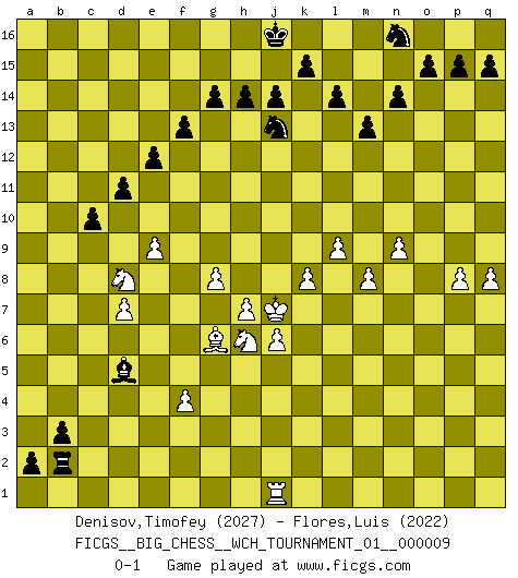 Last move : 0-1 2017 April 12 18:26:2 [Event "FICGS__BIG_CHESS__WCH_TOURNAMENT_01__000009"] [Site "FICGS"] [Date "2016.03.02"] [Round "1"] [White "Denisov,Timofey"] [Black "Flores,Luis"] [Result "0-1"] [WhiteElo "2027"] [BlackElo "2022"] 1.j2-h4 h15-g13 2.d2-d4 j15-k13 3.c1-k8 e15-e13 4.n2-n4 m15-m13 5.o1-j6 p16-o14 6.g2-g4 k16-h15 7.p1-n2 g16-f14 8.b1-d2 b16-c14 9.h1-a8 d15-d13 10.a8-h8 l16-o13 11.a1-c1 n15-n14 12.f1-g2 c16-k9 13.g2-c6 o16-k12 14.e2-e4 k12-l11 15.h8-j7 h16-k14 16.g1-f3 f16-b12 17.j6-g8 h15-j13 18.c6-f9 l11-g7 19.h2-j4 k14-m12 20.h4-j6 g7-c11 21.k1-h2 c11-d12 22.j7-p7 o13-p14 23.m2-m4 m16-m14 24.k8-h10 m14-l14 25.j6-l7 k9-o13 26.j4-g5 m12-h8 27.h10-k12 g13-h11 28.k12-n9 f14-g12 29.f9-d11 e13-e12 30.d11-e10 g12-f10 31.g8-k5 d12-e13 32.n2-l3 e16-e14 33.l1-p5 h8-j7 34.l3-m5 f15-f13 35.h3-h4 b12-d14 36.p5-m8 e14-g14 37.j1-j2 c14-d12 38.e10-j6 d12-f11 39.h2-k3 f11-g9 40.k3-j5 g14-g11 41.m1-h1 g11-a11 42.a2-a3 j7-b7 43.e1-e3 b15-b14 44.e3-b3 b7-h13 45.q1-j1 a11-a7 46.f3-h2 g9-j8 47.g5-h7 j8-l7 48.m5-l7 f10-h9 49.b3-h3 h9-j7 50.k5-l4 j7-l8 51.n9-o10 h11-j9 52.h7-j9 l8-j9 53.l4-k5 j9-l8 54.n4-n5 l8-k6 55.j5-k7 k6-j8 56.l7-j8 o13-j8 57.h2-j4 e13-k8 58.c1-d1 h13-f11 59.j4-l5 a16-f16 60.h4-h5 f11-c8 61.h5-h6 c8-c2 62.b2-b4 c2-c10 63.l2-l4 c10-a10 64.h6-h7 j8-f11 65.l5-m7 k8-f4 66.m8-g3 f4-g3 67.o10-g3 a15-a13 68.d2-b1 f16-f14 69.g3-m8 f14-g14 70.f2-f3 g14-g10 71.m7-k6 f11-g12 72.k6-j8 g10-c10 73.p7-p6 g12-h13 74.p6-k6 a7-c7 75.k5-m7 g15-g14 76.o2-o4 q16-m16 77.d1-c1 l14-l11 78.c1-c7 c10-c7 79.m8-k10 l11-c11 80.k10-e5 c7-c2 81.e5-h2 a10-m10 82.m7-l8 m16-m14 83.k6-m8 m10-m8 84.k7-m8 m14-l14 85.d4-d5 d14-c13 86.m4-m5 l14-l11 87.h3-h5 l11-p11 88.p2-p3 p11-q11 89.q2-q4 q11-p11 90.p3-p4 p11-k11 91.n5-n6 h13-d9 92.h5-k5 d9-j4 93.k5-k11 c11-k11 94.k2-k4 j4-g2 95.h1-c1 k11-c11 96.c1-c2 c11-c2 97.g4-g5 c13-h8 98.g5-g6 g2-j4 99.g6-g7 h8-j7 100.m8-k9 j7-f4 101.j1-h1 f4-h2 102.h1-h2 c2-c1 103.b1-d2 c1-o1 104.h2-h4 j4-d9 105.d2-c4 o1-o4 106.n6-n7 o4-o2 107.j2-h3 o2-c2 108.c4-e5 p14-m11 109.h3-g3 c2-a2 110.e5-c4 m11-o9 111.k4-k5 d9-a6 112.e4-e5 a2-c2 113.c4-d6 o9-l12 114.e5-e6 c2-d2 115.h4-h5 d2-a2 116.d6-f7 a2-a3 117.g7-g8 a3-b3 118.h5-h4 b3-c3 119.e6-e7 c3-c4 120.f7-h8 c4-c11 121.h4-h6 a6-b7 122.d5-d6 k13-j11 123.k9-j11 c11-j11 124.k5-k6 b7-g12 125.g3-h4 g12-l8 126.j6-l8 j11-b11 127.j3-j4 b11-b4 128.h4-j5 c15-c13 129.p4-p5 d13-d12 130.m5-m6 l12-o9 131.m6-m7 o9-p8 132.l4-l5 p8-k3 133.l8-h5 b4-b5 134.k6-k7 b14-b13 135.m7-m8 a13-a12 136.h6-l6 l15-l14 137.l6-p6 o14-n16 138.p6-h6 a12-a11 139.e7-e8 k3-h1 140.j5-k6 b5-b6 141.k7-k8 h1-j2 142.k6-j7 b13-b12 143.l5-l6 c13-c12 144.n7-n8 a11-a10 145.l6-l7 b12-b11 146.j4-j5 c12-c11 147.p5-p6 d12-d11 148.q4-q5 b11-b10 149.l7-l8 c11-c10 150.l8-l9 b10-b9 151.q5-q6 a10-a9 152.p6-p7 a9-a8 153.n8-n9 a8-a7 154.q6-q7 j2-d7 155.e8-e9 a7-a6 156.j5-j6 a6-a5 157.q7-q8 a5-a4 158.h8-f7 a4-a3 159.h5-g6 a3-a2 160.h6-h1 d7-e6 161.j8-h6 b6-b2 162.f7-g5 e6-d5 163.h1-j1 b9-b8 164.p7-p8 b8-b7 165.f3-f4 b7-b6 166.g5-f7 b6-b5 167.d6-d7 b5-b4 168.f7-d8 b4-b3 0-1 Follow this game move after move (download)I feel as if I were a piece in a game of Chess, when my opponent says of it: That piece cannot be moved. (Soren Kierkegaard) Ich trinke, ich rauche, ich spiele, ich liebe Frauen aber Fernschach ist ein Laster, das ich nicht habe. (Mikhail Nekhemyevich Tal) El Peón aislado arroja penumbra sobre todo el tablero. (Aaron Nimzovich) En blitz, le Cavalier l'emporte sur le Fou. (Vlastimil Hort) My poor ole parrot... Is not in the circulation of displays ....poo hoo hoo :) (Wayne Lowrance's enigma)