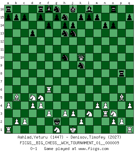 Last move : 0-1 2016 September 9 18:54:46 [Event "FICGS__BIG_CHESS__WCH_TOURNAMENT_01__000009"] [Site "FICGS"] [Date "2016.03.02"] [Round "1"] [White "Aahlad,Yeturu"] [Black "Denisov,Timofey"] [Result "0-1"] [WhiteElo "1447"] [BlackElo "2027"] 1.m2-m4 j15-h13 2.e2-e4 d15-d13 3.j2-k4 h16-o10 4.h2-g4 c16-k9 5.d2-d4 o10-l10 6.b1-c3 n15-n14 7.h1-p8 b16-d15 8.l1-p5 d15-e13 9.c1-l9 e13-g12 10.f1-b5 p16-o14 11.n2-n4 g12-h10 12.p1-o3 o14-n12 13.o1-d11 h10-j8 14.l9-k8 o16-h10 15.k4-j6 l10-l2 16.k1-l3 l2-d9 17.d11-g8 d9-d8 18.k8-h10 j8-h10 19.g8-l12 d8-d6 20.g4-e5 d6-j6 21.p8-p15 o15-o14 22.p15-p10 j6-d6 23.e1-e3 q16-p16 24.p10-k10 h15-j13 25.l12-j10 n12-l11 26.j10-k9 l11-k9 27.c3-d5 m16-o16 28.e3-f3 p16-p8 29.f3-f6 d6-b8 30.a2-a4 b8-j8 31.f2-f3 k16-h15 32.q2-q4 f15-f14 33.m1-m3 j8-g8 34.m3-n3 g8-g2 0-1 Follow this game move after move (download)Without error there can be no brilliancy. (Emanuel Lasker) Ich hatte Angst gegen einen russischen Großmeister zu verlieren, und er befürchtete gegen einen kleinen Jungen zu verlieren. (über ein Remis gegen Juri Awerbach). (Robert James Fischer) Debió haber existido una vez en que los hombres eran semidióses, de otra manera no hubiesen podido inventar el Ajedrez. (Gustav Schenk) Si le désir cupide (et stupide) de gagner est une inépuisable source de souffrance, une combinaison brillante sur l'échiquier est une découverte : le coquelicot qui s'épanouit lorsque apparaît la Voie Lactée. (Arrabal) Gambling is the son of avarice and the father of despair. (French proverb)