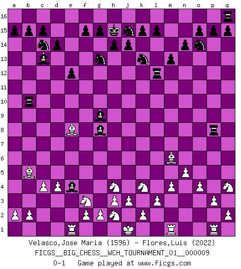 Last move : 0-1 2016 March 18 23:32:26 [Event "FICGS__BIG_CHESS__WCH_TOURNAMENT_01__000009"] [Site "FICGS"] [Date "2016.03.02"] [Round "1"] [White "Velasco,Jose Maria"] [Black "Flores,Luis"] [Result "0-1"] [WhiteElo "1596"] [BlackElo "2022"] 1.j2-k4 h15-g13 2.n2-n4 j15-k13 3.m2-m4 p16-o14 4.e2-e4 e15-e13 5.d2-d4 b16-c14 6.o1-d11 e13-e12 7.d11-g8 m15-m13 8.c1-k8 h16-q8 9.l1-o4 l16-o13 10.p1-o3 f16-c13 11.f1-b5 d15-d14 12.h1-l4 k16-l14 13.l4-j6 g16-j15 14.g8-f9 l14-j13 15.k8-l9 q8-l8 16.j6-o6 n15-n14 17.o4-p5 c16-k9 18.b1-d2 o16-g9 19.o6-m8 l8-m8 20.p5-m8 j13-k11 21.l9-k10 g9-j7 22.d2-f3 k9-e4 23.c2-c3 e4-j8 24.n4-n5 k11-h10 25.f9-k5 h10-k9 26.m8-n9 m16-m14 27.k5-o9 m14-l14 28.k1-l3 l14-l10 29.k10-f6 e16-e13 30.o9-k5 a16-e16 31.g1-j2 l10-n10 32.n9-o8 e13-f13 33.f6-b10 n10-b10 34.c3-c4 k9-l7 35.k5-f9 f13-f10 36.e1-e7 f10-p10 37.k4-h5 j7-k8 38.o3-q4 l7-n6 39.o8-n9 k8-h10 40.e7-e6 n6-l7 41.q1-p1 l7-m5 42.l3-m5 j8-m5 43.h5-k4 m5-j8 44.a1-e1 h10-g9 45.l2-l3 e16-e13 46.p2-p3 e13-f13 47.n9-m8 f13-f12 48.o2-o4 p10-p8 49.m8-l7 f12-l12 50.l7-m6 j8-h7 51.f9-e8 h7-f5 52.e6-j6 j16-h15 53.j2-h4 f5-h7 54.j6-e6 h7-g8 55.e6-e4 o13-e4 0-1 Follow this game move after move (download)The essence of Chess is thinking about what Chess is. (David Bronstein) Ich bin stolz ein Bulgare zu sein. (Veselin Topalov) Todos los Maestros de Ajedrez fueron un día unos principiantes. (Chernev) Aucun coup ne doit être joué sans but. (Pedro Damiano) A good programmer is someone who always looks both ways before crossing a one-way street. (Doug Linder)