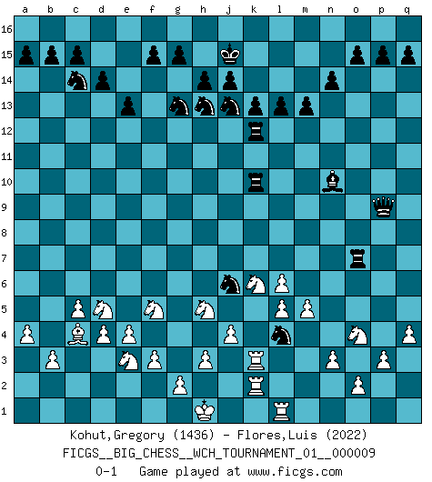 Last move : 0-1 2016 August 5 16:3:55 [Event "FICGS__BIG_CHESS__WCH_TOURNAMENT_01__000009"] [Site "FICGS"] [Date "2016.03.02"] [Round "1"] [White "Kohut,Gregory"] [Black "Flores,Luis"] [Result "0-1"] [WhiteElo "1436"] [BlackElo "2022"] 1.j2-h4 h15-g13 2.b1-c3 j15-k13 3.p1-o3 p16-o14 4.d2-d3 m15-m13 5.n2-n3 l16-p12 6.m2-m4 e15-e13 7.l1-m2 n15-n14 8.e2-e4 b16-c14 9.f1-e2 p12-o13 10.h2-j4 f16-c13 11.c1-d2 d15-d14 12.k1-h2 c16-k9 13.e2-j6 o16-g9 14.m2-h6 e16-e14 15.h2-g4 e14-f14 16.h1-l4 m16-m14 17.l2-l3 m14-l14 18.l4-j2 a16-e16 19.g1-f3 l14-l12 20.o3-n5 f14-f12 21.o1-k5 q16-m16 22.c3-d5 e16-e14 23.n5-l6 m16-m14 24.l6-k4 m14-l14 25.j6-g8 l12-p12 26.p2-p3 k9-j8 27.q1-n1 p12-q12 28.q2-q4 e14-f14 29.l3-l4 k16-h15 30.k2-k3 h16-l13 31.d2-e3 g9-c5 32.c2-c4 c5-e3 33.h6-e3 c13-h8 34.a1-b1 l13-l11 35.b2-b3 g16-j15 36.l4-l5 f12-a12 37.a2-a4 f14-f8 38.j2-n2 o13-p14 39.m1-l1 f8-b8 40.g8-f9 q12-b12 41.f9-b5 a12-a10 42.n1-m1 a10-o10 43.n2-h2 j8-o3 44.m1-m2 b8-b9 45.l1-k1 l14-l12 46.k1-k2 k13-j11 47.e1-d1 o3-g10 48.d1-c1 j15-h13 49.k5-m3 h8-b2 50.c1-c2 b2-g7 51.h4-j2 l11-o11 52.m2-l2 g10-j8 53.m3-l4 g7-j9 54.c2-c1 j8-h7 55.k4-m3 h7-l4 56.k3-l4 l12-k12 57.k2-k12 b12-k12 58.j2-k4 o11-k7 59.h2-c7 k7-l8 60.f3-h4 l8-l11 61.h4-f3 j9-b2 62.c1-c2 b2-j9 63.j1-j2 k12-g12 64.c2-c1 j9-g11 65.c7-j1 l11-j9 66.j1-k2 p14-q13 67.f3-h2 j9-j8 68.c1-j1 g11-k8 69.j4-g3 k8-e3 70.g4-e3 j8-f8 71.j1-f1 g12-o12 72.h2-j4 b9-k9 73.j4-k6 k15-k13 74.j3-j4 l15-l13 75.g3-f5 h15-j13 76.k2-e7 f8-b12 77.f2-f3 j16-j15 78.f1-k1 k9-o9 79.m3-o4 o9-o7 80.e7-k2 q13-k7 81.l5-l6 k7-q13 82.m4-m5 o12-k12 83.l4-l5 o10-k10 84.k2-m4 b12-j5 85.m4-j1 q13-n10 86.l2-l1 j11-k9 87.j1-g3 j5-j9 88.g3-e1 k9-l7 89.j2-h2 l7-j8 90.k4-h5 j8-l7 91.e1-j1 l7-j6 92.k1-k3 j9-p9 93.j1-l3 o14-n12 94.b1-d1 n12-m10 95.c4-c5 m10-l8 96.d1-k1 l8-n7 97.l3-l4 n7-p6 98.d3-d4 p6-n5 99.l4-l3 n5-p4 100.k1-k2 p4-o6 101.l3-l4 o6-p4 102.h2-h1 p4-n5 103.b5-c4 n5-l4 0-1 Follow this game move after move (download)A thorough understanding of the typical mating continuations makes the most complicated sacrificial combinations leading up to them not only not difficult, but almost a matter of course. (Siegbert Tarrasch) Bogoljubow: Matt in vier Zügen! Tartakower: Ich verbitte mir jede Belästigung! (Savielly Grigorievitsch Tartakower) El Ajedrez es tortura mental. (Garry Kasparov) La conception d'un plan est le processus par lequel un joueur exploite les avantages de sa position tout en s'efforçant d'en réduire au minimum les inconvénients. Afin de garantir le succès, un plan doit toujours se fonder sur un diagnostic objectif des particularités d'une position. La conception d'un plan est d'autant plus difficile que la position est équilibrée, et grandement facilitée lorsqu'il n'existe qu'un seul plan susceptible de répondre aux exigences de la position. (Harry Golombek) In God we trust, all others we virus scan. (Anonymous)