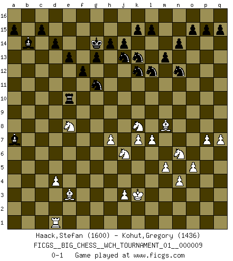 Last move : 0-1 2016 November 27 19:47:4 [Event "FICGS__BIG_CHESS__WCH_TOURNAMENT_01__000009"] [Site "FICGS"] [Date "2016.03.02"] [Round "1"] [White "Haack,Stefan"] [Black "Kohut,Gregory"] [Result "0-1"] [WhiteElo "1600"] [BlackElo "1436"] 1.j2-k4 p16-o14 2.p1-o3 j15-k13 3.b1-c3 b16-c14 4.g2-g4 m15-m13 5.m2-m4 h16-o10 6.h3-h4 e15-e13 7.d2-d3 l16-p12 8.e2-e4 n15-n14 9.k1-l3 f16-c13 10.f1-k5 d15-d14 11.n2-n4 o16-d6 12.f2-f4 c16-l8 13.k5-j6 l8-j6 14.o1-j6 p12-j6 15.k4-j6 e16-e14 16.e4-e5 d6-g9 17.h2-k3 e14-g14 18.g4-g5 m16-m14 19.g1-h3 a16-e16 20.l1-n3 m14-l14 21.h3-j5 e16-e14 22.q2-q4 l14-l12 23.k3-l5 g14-g12 24.j5-h7 g9-d12 25.k2-k4 k16-l14 26.h1-e4 e14-g14 27.c1-e3 g16-j15 28.l3-m5 h15-k14 29.l2-l4 o10-p10 30.m1-p1 d12-e11 31.p2-p4 j16-h15 32.p4-p5 p10-o11 33.o3-n5 q16-e16 34.o2-o4 f15-f13 35.q4-q5 f13-f12 36.p5-p6 e16-e14 37.m5-l7 e14-f14 38.o4-o5 c13-b14 39.n3-p5 f14-f13 40.f4-f5 l12-q12 41.q5-q6 q12-n12 42.p6-p7 o11-m11 43.e4-a8 f13-h13 44.p1-m1 h13-h7 45.g5-g6 h7-h13 46.k4-k5 m11-l11 47.l5-n6 l11-e5 48.j1-k2 e5-f5 49.l4-l5 h15-h16 50.m1-g1 g12-g6 51.e1-f1 f5-d7 52.g1-g6 g14-g6 53.q1-g1 n12-g12 54.g1-g6 g12-g6 55.f1-g1 d7-g10 56.g1-g6 g10-g6 57.a1-g1 g6-m11 58.m4-m5 m11-l12 59.a8-g2 g15-g13 60.c3-e4 l12-a2 61.g2-g12 a2-b2 62.g12-c16 j15-g16 63.c16-b15 c14-a13 64.b15-e12 b2-c2 65.e4-f2 c2-c14 66.e12-c14 a13-c14 67.f2-g4 o14-n12 68.k2-k3 h13-h9 69.n5-l6 c14-d12 70.l6-k8 h9-d9 71.d3-d4 g16-f14 72.q6-q7 k14-l12 73.l5-l6 d12-f13 74.h4-h5 f14-h13 75.l7-j8 f13-g11 76.j8-h10 l14-j13 77.g4-f6 h16-g15 78.h5-h6 e11-a7 79.p5-m8 d9-d10 80.g1-d1 d10-h10 81.h6-h7 h10-d10 82.k5-k6 g15-g14 83.f6-e8 d10-b10 84.k6-k7 h13-k12 85.l6-l7 b10-e10 0-1 Follow this game move after move (download)An attack on the wing should be met by play in the center. (Nimzovitch) Der Schachmeister von Heute braucht Courage, einen Killerinstinkt, Ausdauer und Arroganz. (Larry Evans) De todos mis libros Rusos, la defensa contiene y difunde el 'calor' mas grande que pudiese verse extraño al observar lo supremamente abstracto que el Ajedrez supuestamente es. (Vladimir Nabokov) Il a essayé de se convaincre qu'il pourrait empêcher toutes les erreurs et ne jamais perdre. L'horreur ! Gary Kasparov au sujet de Robert Fischer. The age of a woman doesn't mean a thing. The best tunes are played on the oldest fiddles. (Ralph Waldo Emerson)