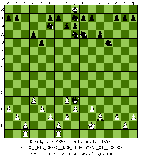 Last move : 0-1 2016 June 23 14:49:9 [Event "FICGS__BIG_CHESS__WCH_TOURNAMENT_01__000009"] [Site "FICGS"] [Date "2016.03.02"] [Round "1"] [White "Kohut,Gregory"] [Black "Velasco,Jose Maria"] [Result "0-1"] [WhiteElo "1436"] [BlackElo "1596"] 1.p1-o3 j15-k13 2.b1-c3 d15-d13 3.j2-k4 m15-m13 4.d2-d4 n15-n13 5.m2-m4 c15-c13 6.c1-j7 e15-e13 7.h1-m5 e13-e12 8.l1-p5 l16-p12 9.e2-e4 h16-o10 10.p5-m8 o10-j10 11.m8-k6 h15-g13 12.j7-c13 f16-c13 13.k6-c13 o16-f8 14.g1-j2 c16-g12 15.m5-d5 j10-a10 16.c13-h8 p16-o14 17.h8-n13 g12-j10 18.d5-g5 q16-n16 19.n13-e5 j10-l8 20.n2-n3 e16-c16 21.d4-d5 k16-h15 22.k1-l3 g16-j15 23.o1-n2 b16-d15 24.l3-j4 a10-o10 25.e5-g3 o10-p10 26.q1-p1 d15-f14 27.a1-c1 f8-k12 28.g3-f4 c16-c10 29.f1-b5 a16-c16 30.g5-g3 k12-m10 31.f4-m10 p10-m10 32.j2-h4 c10-b10 33.a2-a4 n16-n11 34.g3-e3 m10-l11 35.f2-f3 m16-n16 36.b2-b3 c16-c3 37.e3-e2 b10-c10 38.b5-c4 l11-l9 39.m1-m3 n11-c11 40.m3-l3 l9-m10 41.c1-b1 l8-h11 42.c4-d3 c3-c9 43.b1-d1 h11-f9 44.n2-m1 c11-l11 45.l3-l11 m10-l11 46.e2-f1 p12-k7 47.f1-h1 f9-l4 48.k2-k3 l4-q9 49.m1-n2 c9-l9 50.h1-j2 k7-f11 51.j2-k2 f11-n4 52.l2-l4 c10-h10 53.j1-j2 l11-g7 54.e1-g1 n16-n11 55.h2-g4 q9-p10 56.g4-h2 n11-h11 57.o3-m2 n4-f11 58.o2-o3 f11-d9 59.k4-m5 l9-k9 60.p1-m1 g7-d7 61.d3-b5 d7-c8 62.b5-h11 h10-h11 63.d1-d2 d9-j4 64.h2-j4 p10-j4 65.k3-j4 k9-k2 66.j2-k2 c8-k8 67.m5-k4 k8-d2 68.g1-c1 h15-j13 69.m1-g1 d2-k8 70.q2-q3 h11-h4 71.j3-h4 k8-k4 72.k2-l2 k4-j3 73.h4-h5 j3-n3 74.n2-o1 n3-m4 75.m2-k3 m4-k6 76.k3-m2 o14-n12 77.g1-k1 k6-g3 78.k1-g1 g13-f11 79.m2-k3 f11-g9 80.o1-n2 g9-h7 81.n2-m3 h7-j5 82.k3-j5 g3-j5 0-1 Follow this game move after move (download)A good player is always lucky. (Jose Raul Capablanca) Über Kasparov: Es ist offensichtlich, daß er in einem totalitären Staat aufwuchs und deshalb zu diktatorischen Zügen neigt. (Viktor Kortschnoi) La pasion por jugar al Ajedrez es una de las mas inexplicables en el mundo. (H.G. Wells) Le pion, dans sa simplicité, marche droit devant lui, mais lorsqu'il prend, il le fait obliquement? Ainsi l'homme, tant qu'il reste pauvre, marche dans la droiture et vit honnêtement, mais lorsqu'il recherche les honneurs, il flatte, se parjure et, par les voies obliques, cherche une position supérieure sur l'échiquier du monde. (Jean de Galles) You can think I'm wrong, but that's no reason to quit thinking. (Gregory House, House M.D.)