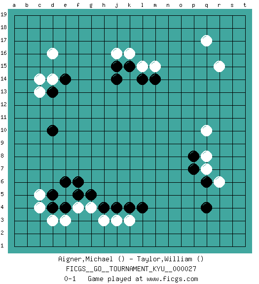 Last move : 0-1 2007 May 12 18:45:5 [Event "FICGS__GO__TOURNAMENT_KYU__000027"] [Site "FICGS"] [Date "2007.03.22"] [Round "1"] [Black "Aigner,Michael"] [White "Taylor,William"] [Result "0-1"] 1.q4 c4 2.k4 d16 3.d10 q17 4.f6 e3 5.d4 d3 6.e4 f4 7.f5 g4 8.g5 k16 9.k15 l15 10.j15 j16 11.l14 m15 12.m14 r15 13.j14 c5 14.d5 q10 15.h4 h3 16.j4 j3 17.l4 k3 18.e6 r6 19.q6 q7 20.p7 q8 21.p8 c13 22.d13 d14 23.e14 c14 0-1 Here are the names of the openings (joseki) played in the four corners : Corner d4 : c4 f6 Komoku (Somok, Xiao~mu`) 3-4 Point. The komoku (3-4) point is the traditional corner enclosure move.. Corner d16 : d16 j15 Hoshi (Hwajeom, Seongjeom, Xingwei`) 4-4 Point. The star or hoshi (4-4) point, emphasizing influence at the potential expense of territory. Player White won this Go (weiqi, baduk) game. Follow this game move after move (download)Nothing requires doing this or that, but necessity exists. (Pierre Audouard) Memory is a way of holding onto the things you love, the things you are, the things you never want to lose. (from the television show: The Wonder Years)