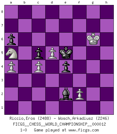 Last move : 1-0 2016 July 10 3:0:52 [Event "FICGS__CHESS__WORLD_CHAMPIONSHIP__000012"] [Site "FICGS"] [Date "2016.03.02"] [Round "7"] [White "Riccio,Eros"] [Black "Wosch,Arkadiusz"] [Result "1-0"] [WhiteElo "2488"] [BlackElo "2246"] 1.e4 e5 2.Nf3 Nc6 3.Bb5 a6 4.Ba4 b5 5.Bb3 Na5 6.O-O d6 7.d4 exd4 8.Nxd4 Bb7 9.Bd2 Nxb3 10.Nxb3 Nf6 11.Na5 Qc8 12.Nc3 Be7 13.Qf3 O-O 14.Nd5 Nxd5 15.exd5 Bf6 16.c3 Rb8 17.Be3 Re8 18.Rad1 Re5 19.Rd3 Rf5 20.Qd1 b4 21.c4 Bxb2 22.Rb3 Bc3 23.a3 c5 24.Qd3 h5 25.Rc1 Re5 26.Bf4 Qc7 27.Rbxc3 bxc3 28.Bxe5 dxe5 29.Qxc3 f6 30.Re1 h4 31.h3 Qb6 32.Qd2 g5 33.Re3 Qd6 34.g4 hxg3 35.Rxg3 Bc8 36.h4 Qd7 37.Qd3 Qf5 38.hxg5 Kf7 39.Kg2 Qxd3 40.Rxd3 Bf5 41.Rb3 Rxb3 42.Nxb3 Bd3 43.Na5 e4 44.gxf6 Kxf6 45.Kg3 Ke5 46.Kg4 Bf1 47.Kg5 Bd3 48.a4 Be2 49.Kg6 1-0 Ruy Lopez : Taimanov (chase/wing/Accelerated counterthrust) variation Kingside Castling by player White (move 6) Kingside Castling by player Black (move 13) Player White won this chess game. Follow this game move after move (download)The tactician must know what to do whenever something needs doing; the strategist must know what to do when nothing needs doing. (Savielly Tartakover) Oft bringt ein stiller Zug das Erdbeben. (Richard Reti) Todos los Maestros de Ajedrez fueron un día unos principiantes. (Chernev) Je ne suis pas le dernier à jouer lâchement des coups douteux pendant le zeïtnot de l'adversaire pour l'achever: en effet les coups qui font le plus peur sont ceux que l'on ne comprend pas. Je me fais souvent peur quand je joue. (Un professeur anonyme) A shortcut is the longest distance between two points. (Don Groves)