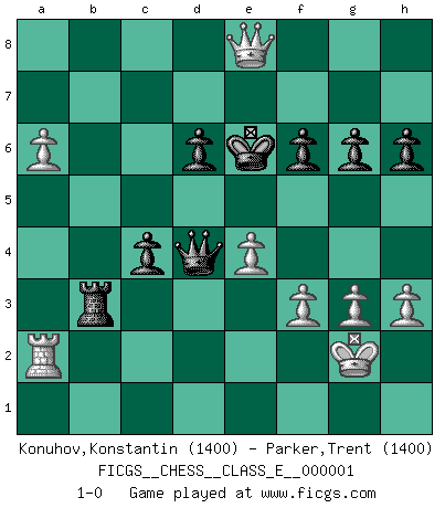 Last move : 1-0 2006 May 29 1:20:30 [Event "FICGS__CHESS__CLASS_E__000001"] [Site "FICGS"] [Date "2006.04.10"] [Round "1"] [White "Konuhov,Konstantin"] [Black "Parker,Trent"] [Result "1-0"] [WhiteElo "1400"] [BlackElo "1400"] 1.d4 Nf6 2.c4 c5 3.d5 b5 4.cxb5 a6 5.bxa6 Bxa6 6.Nc3 g6 7.Nf3 Bg7 8.e4 Bxf1 9.Rxf1 d6 10.Bg5 O-O 11.a4 Nbd7 12.Nd2 Qb6 13.Qc2 Rfb8 14.Nb5 Qa5 15.Ke2 h6 16.Nc4 Qa6 17.Bf4 Qb7 18.f3 Nb6 19.Nxb6 Qxb6 20.Bd2 Ne8 21.Bc3 Nc7 22.Nxc7 Qxc7 23.Bxg7 Kxg7 24.Qc3+ f6 25.Rfc1 Qb7 26.Ra2 Qa6+ 27.Qd3 Qa5 28.Rc4 Rb4 29.Rxb4 Qxb4 30.Qc2 c4 31.h3 Kf7 32.g3 e6 33.dxe6+ Kxe6 34.a5 Qb5 35.Qa4 Qa6 36.Kf2 Qa7+ 37.Kg2 Qd4 38.b3 Rb8 39.a6 Rxb3 40.Qe8+ 1-0 Benko gambit accepted Kingside Castling by player Black (move 10) Player White won this chess game. Follow this game move after move (download)The passed pawn is a criminal, who should be kept under lock and key. Mild measures, such as police surveillance, are not sufficient. (Nimzovitch) Auf jeden Fall musst du zuerst Rechtsanwalt werden, damit du deine eigenen Interessen und die deiner Familie vertreten kannst. [Brief an seinen Sohn] (José Raúl Capablanca) El Ajedrez es imaginación. (David Bronstein) La victoire dans une partie d'Echecs appartient la plupart du temps à celui qui voit un peu plus loin que l'adversaire. (Lasker) Remember : Your focus determines your reality. (Qui-Gon Jinn in Star Wars ep.1)