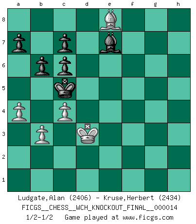 Last move : 1/2-1/2 2016 March 28 12:53:55 [Event "FICGS__CHESS__WCH_KNOCKOUT_FINAL__000014"] [Site "FICGS"] [Date "2016.03.02"] [Round "4"] [White "Ludgate,Alan"] [Black "Kruse,Herbert"] [Result "1/2-1/2"] [WhiteElo "2406"] [BlackElo "2434"] 1.c4 e5 2.Nc3 Nf6 3.Nf3 Nc6 4.d4 exd4 5.Nxd4 Bb4 6.Bg5 h6 7.Bh4 O-O 8.e3 Re8 9.Nxc6 dxc6 10.Qxd8 Rxd8 11.Rc1 Be6 12.a3 Be7 13.Be2 Rd7 14.f3 Rad8 15.Rd1 g5 16.Bf2 Ne8 17.Rxd7 Rxd7 18.h4 Nd6 19.hxg5 hxg5 20.b3 f5 21.Rh6 Bf7 22.Bd3 Kg7 23.Rh1 Bf6 24.Ne2 Ne4 25.Bc2 Nxf2 26.Kxf2 f4 27.Rd1 Rxd1 28.Bxd1 Be5 29.g3 fxe3+ 30.Kxe3 Bd6 31.a4 Kf6 32.f4 Bh5 33.Bc2 Bg4 34.Be4 Ba3 35.Kd3 gxf4 36.gxf4 Bd6 37.Ke3 Bxe2 38.Kxe2 Bxf4 39.Kd3 Bd6 40.Bg2 Ke5 41.Bh3 Be7 42.Bc8 b6 43.Bd7 Kd6 44.Be8 Kc5 1/2-1/2 English Opening Kingside Castling by player Black (move 7) This chess game ended in a draw. Follow this game move after move (download)In a gambit you give up a Pawn for the sake of getting a lost game. (Samuel Standige Boden) Fischer ist das größte Genie, das je vom Schachhimmel heruntergestiegen ist. (Mikhail Nekhemyevich Tal) El pensamiento metódico es mas útil en el Ajedrez que la inspiración. (C. J. S. Purdy) Des points faibles ou des trous dans la position de l'adversaire doivent être occupés par des pièces et non pas par des pions. (Siegbert Tarrasch) Vladimir Ras-Putin is still alive... He is also a good actor, I saw him in the Lord of the Rings. (Rodolfo d'Ettorre)