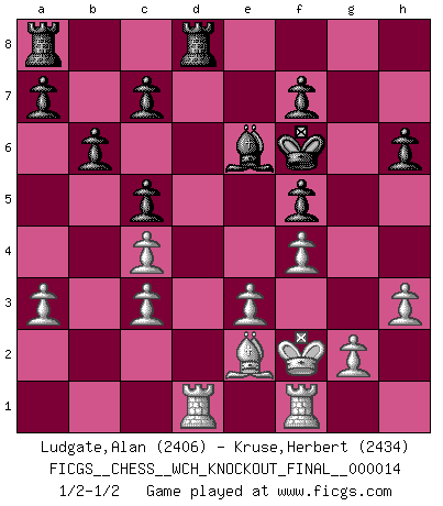 Last move : 1/2-1/2 2016 March 14 18:3:1 [Event "FICGS__CHESS__WCH_KNOCKOUT_FINAL__000014"] [Site "FICGS"] [Date "2016.03.02"] [Round "6"] [White "Ludgate,Alan"] [Black "Kruse,Herbert"] [Result "1/2-1/2"] [WhiteElo "2406"] [BlackElo "2434"] 1.c4 e5 2.Nc3 Nf6 3.Nf3 Nc6 4.d4 exd4 5.Nxd4 Bb4 6.Bg5 h6 7.Bh4 O-O 8.e3 Re8 9.Nxc6 dxc6 10.Qxd8 Rxd8 11.Bxf6 gxf6 12.Be2 Bxc3+ 13.bxc3 Be6 14.Rd1 c5 15.O-O f5 16.f4 Kg7 17.Kf2 Kf6 18.a3 b6 19.h3 1/2-1/2 English Opening Kingside Castling by player Black (move 7) Kingside Castling by player White (move 15) This chess game ended in a draw. Follow this game move after move (download)If your opponent cannot do anything active, then don't rush the position; instead you should let him sit there, suffer, and beg you for a draw. (Jeremy Silman) Aljechin war kein Nazi. Er war ein Opportunist. Ein schrecklicher Mann. Er liebte Geld über alles und würde für Geld ein Jude, ein Katolik oder ein Protestant werden. (Miguel Najdorf) Una clavada es mas poderosa que una espada. (Fred Reinfeld) Toutes les manuvres exécutées sur une colonne ouverte ont pour but ultime l'intrusion définitive sur la septième ou la huitième rangée, en plein cur de la position ennemie. (Aaron Nimzovitch) How many people work in NATO Headquarters ? - About half of them. (Dirk Stikker, NATO general secretary)