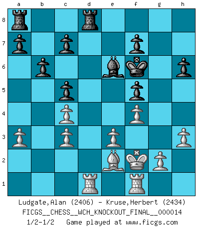 Last move : 1/2-1/2 2016 March 14 18:5:32 [Event "FICGS__CHESS__WCH_KNOCKOUT_FINAL__000014"] [Site "FICGS"] [Date "2016.03.02"] [Round "8"] [White "Ludgate,Alan"] [Black "Kruse,Herbert"] [Result "1/2-1/2"] [WhiteElo "2406"] [BlackElo "2434"] 1.c4 e5 2.Nc3 Nf6 3.Nf3 Nc6 4.d4 exd4 5.Nxd4 Bb4 6.Bg5 h6 7.Bh4 O-O 8.e3 Re8 9.Nxc6 dxc6 10.Qxd8 Rxd8 11.Bxf6 gxf6 12.Be2 Bxc3+ 13.bxc3 Be6 14.Rd1 c5 15.O-O f5 16.f4 Kg7 17.Kf2 Kf6 18.a3 b6 19.h3 1/2-1/2 English Opening Kingside Castling by player Black (move 7) Kingside Castling by player White (move 15) This chess game ended in a draw. Follow this game move after move (download)During a Chess competition a Chessmaster should be a combination of a beast of prey and a monk. (Alexander Alekhine) Ich habe kein Problem mit Frauen, sondern nur mit dem Niveau ihres Schachspiels (Judith Polgar) El juego de Fischer siempre fue nítido, racional y brillante. Uno de los mejores por siempre. (Dave Regis) Ce qui caractérise les parties de combat, c'est que si le défenseur a constamment de difficiles problèmes à résoudre, l'attaquant doit chercher sans relâche de nouvelles possibilités d'attaque. (Koblentz) There is a very easy way to return from a casino with a small fortune : go there with a large one. (Jack Yelton)