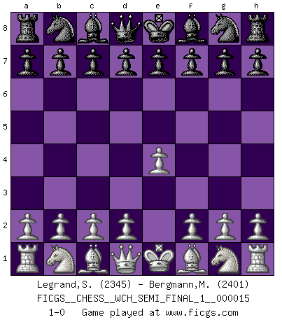 Last move : 1-0 2016 April 3 20:47:28 [Event "FICGS__CHESS__WCH_SEMI_FINAL_1__000015"] [Site "FICGS"] [Date "2016.03.02"] [Round "8"] [White "Legrand,Stephane"] [Black "Bergmann,Michael"] [Result "1-0"] [WhiteElo "2345"] [BlackElo "2401"] 1.e4 1-0 This chess game has been lost on time (started : 2016.03.02 16:32:8) King's pawn Opening Player White won this chess game. Follow this game move after move (download)A man that will take back a move at Chess will pick a pocket. (Richard Fenton) Schach ist ein Reich, wo sich die menschliche Phantasie frei entfalten kann. (David Bronstein) Fischer no está bajo la obligación de nadie. (Joseph Platz) Aux échecs, l'amour-propre est satisfait quand on remporte la victoire, mais il n'y a pas de honte à être battu. (Benjamin Franklin) Wisdom is the reward you get for a lifetime of listening when you'd have preferred to talk. (Doug Larson)