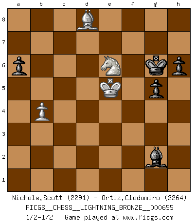 Last move : 1/2-1/2 2016 March 3 16:14:47 [Event "FICGS__CHESS__LIGHTNING_BRONZE__000655"] [Site "FICGS"] [Date "2016.03.03"] [Round "1"] [White "Nichols,Scott"] [Black "Ortiz,Clodomiro"] [Result "1/2-1/2"] [WhiteElo "2291"] [BlackElo "2264"] 1.Nf3 d5 2.d4 e6 3.c4 Nf6 4.g3 c6 5.Bg2 dxc4 6.Ne5 Be7 7.O-O O-O 8.Nxc4 b5 9.Ne5 Qb6 10.a4 Bb7 11.Be3 Nd5 12.Nc3 b4 13.a5 Qd8 14.Ne4 Ba6 15.Qc2 Bb5 16.Rfc1 f6 17.Nd3 Na6 18.Qb3 Qe8 19.Bd2 Rd8 20.f4 Kh8 21.Nef2 e5 22.fxe5 Ndc7 23.Be3 Nd5 24.Bxd5 cxd5 25.Qc2 fxe5 26.Nxe5 Bd6 27.Nfd3 Nb8 28.Rf1 Rc8 29.Qd2 Nc6 30.Nxc6 Qxc6 31.Rfc1 Qd7 32.Rxc8 Rxc8 33.Rf1 Kg8 34.Bf4 Be7 35.Rf2 h6 36.h4 Qe6 37.Be5 Qg4 38.Kh2 Bd7 39.Nf4 Bf5 40.Nxd5 Bxh4 41.Qf4 Qh3+ 42.Kg1 Bg5 43.Qf3 Rc1+ 44.Rf1 Rxf1+ 45.Qxf1 Qg4 46.Qf3 Qxf3 47.exf3 Bd7 48.Nxb4 Bd2 49.Nd3 Bb5 50.Nc5 Bxa5 51.Kf2 Bc6 52.Ne6 g5 53.Ke3 Kf7 54.Ng7 a6 55.g4 Kg6 56.Nf5 Bd8 57.Bc7 Bf6 58.Nd6 Bxd4+ 59.Kxd4 Bxf3 60.Ne4 Bxg4 61.Ke5 Bd7 62.Bd8 Bc6 63.Nc5 Bb5 64.Ne6 Bc6 65.b4 Bg2 1/2-1/2 Reti Opening Kingside Castling by player White (move 7) Kingside Castling by player Black (move 7) 10 pieces endgame at move 59 : White KBNPP , Black KBPPP WHITE : King + 1 Bishop 1 Knight 2 Pawns BLACK : King + 1 Bishop 3 Pawns 9 pieces endgame at move 60 : White KBNP , Black KBPPP WHITE : King + 1 Bishop 1 Knight 1 Pawn BLACK : King + 1 Bishop 3 Pawns This chess game ended in a draw. Follow this game move after move (download)Nothing excites jaded Grandmasters more than a theoretical novelty. (Dominic Lawson) Das Schach hält seine Meister in eigenen Banden, Fesseln; auf vielerlei Weise formt es ihren Geist, so dass die innere Freiheit selbst des Stärksten beeinflusst wird. (Albert Einstein) La caracteristica mas importante en la posición del Ajedrez es la actividad de las piezas. Esto es absolutamente fundamental en todas las fases del juego: Apertura, Juego Medio y especialmente Finales. La limitación primordial en la actividad de una pieza, es la estructuración de los Peones. (Michael Stean) Il n'y a pas de prix trop élevé au scalp de l'ennemi. (Koblentz) We're missing something. (Gregory House, House M.D.)