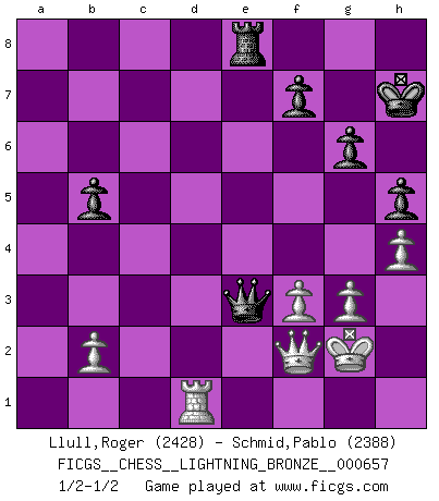 Last move : 1/2-1/2 2016 March 4 20:47:29 [Event "FICGS__CHESS__LIGHTNING_BRONZE__000657"] [Site "FICGS"] [Date "2016.03.04"] [Round "1"] [White "Llull,Roger"] [Black "Schmid,Pablo"] [Result "1/2-1/2"] [WhiteElo "2428"] [BlackElo "2388"] 1.e4 e5 2.Nf3 Nc6 3.Bb5 a6 4.Ba4 Nf6 5.O-O Be7 6.Re1 b5 7.Bb3 O-O 8.c3 d5 9.exd5 Nxd5 10.Nxe5 Nxe5 11.Rxe5 c6 12.d4 Bd6 13.Re1 Qh4 14.g3 Qh3 15.Be3 Bg4 16.Qd3 Rae8 17.Nd2 Re6 18.a4 Qh5 19.axb5 axb5 20.Nf1 Bf5 21.Qd2 Be4 22.Bd1 Qf5 23.Qe2 Nf6 24.Bd2 Qg6 25.Bb3 Re7 26.Qd1 Qf5 27.Ne3 Qh3 28.Qe2 c5 29.f3 Bb7 30.Qf2 Qd7 31.Bc2 g6 32.Ng2 cxd4 33.Bg5 Re6 34.cxd4 Bc7 35.Bb3 Rd6 36.Ne3 Bb6 37.Rad1 h5 38.h4 Re8 39.Kh2 Kh7 40.Rd3 Bxd4 41.Red1 Bxe3 42.Rxd6 Qxd6 43.Bxe3 Bd5 44.Bxd5 Nxd5 45.Bc5 Qe5 46.Bd4 Qe6 47.Kg2 Ne3+ 48.Bxe3 Qxe3 1/2-1/2 Ruy Lopez : Closed, 7...O-O Kingside Castling by player White (move 5) Kingside Castling by player Black (move 7) This chess game ended in a draw. Follow this game move after move (download)Nowadays, when you're not a grandmaster at 14, you can forget about it. (Anand Viswanathan) Man kann eine Schachpartie nur gewinnen, wenn das Gleichgewicht gestört ist. In einer Stellung mit ungestörtem Gleichgewicht ist auch das größte Genie hilflos - in der Stellung steckt dann eben kein genialer Einfall. (Wilhelm Steinitz) Nunca antes ha habido un jugador de Ajedrez con tal conocimiento a fondo de las complejidades del juego y una inmensa voluntad absolutamente indomable de ganar. Yo pienso que Fischer es el jugador mas grande que jamás haya existido. (Lisa Lane) Les Cavaliers se révèlent fort utiles dans les positions fermées. D'habitude, les Fous sont un peu plus forts que les Cavaliers dans les positions ouvertes. Qu'on le veuille ou non, il restera toujours des exceptions ! A good book on your shelf is a friend that turns its back on you and remains a friend. (Author unknown)