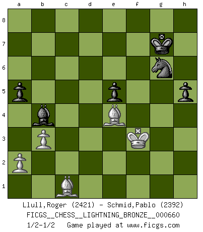 Last move : 1/2-1/2 2016 March 7 0:4:1 [Event "FICGS__CHESS__LIGHTNING_BRONZE__000660"] [Site "FICGS"] [Date "2016.03.06"] [Round "1"] [White "Llull,Roger"] [Black "Schmid,Pablo"] [Result "1/2-1/2"] [WhiteElo "2421"] [BlackElo "2392"] 1.e4 e5 2.Nf3 Nc6 3.d4 exd4 4.Nxd4 Nf6 5.Nc3 Bb4 6.Nxc6 bxc6 7.Bd3 d5 8.exd5 cxd5 9.O-O O-O 10.Bf4 Bg4 11.f3 Be6 12.Ne2 Nh5 13.Be3 Bd6 14.g4 Nf6 15.Qd2 Nd7 16.Nf4 Ne5 17.Be2 Re8 18.Rae1 Rb8 19.b3 c5 20.c3 Qc7 21.Nxe6 Rxe6 22.f4 Nc6 23.f5 Re7 24.f6 gxf6 25.Rxf6 Bxh2+ 26.Kf1 Re6 27.Rxe6 fxe6 28.Bxc5 Bf4 29.Qd3 a5 30.c4 Rc8 31.Ba3 Qf7 32.Kg2 Ne5 33.Qd4 Ng6 34.Rf1 e5 35.Qb6 Kg7 36.Qd6 dxc4 37.Bxc4 Qb7+ 38.Qd5 Qxd5+ 39.Bxd5 Rc3 40.Rf2 Rd3 41.Be4 Rg3+ 42.Kf1 Rxg4 43.Rg2 Rxg2 44.Kxg2 Bd2 45.Kf3 Bb4 46.Bc1 h5 1/2-1/2 Scotch : Schmidt variation Kingside Castling by player White (move 9) Kingside Castling by player Black (move 9) This chess game ended in a draw. Follow this game move after move (download)Place the contents of the Chess box in a hat, shake them up vigorously, pour them on the board from a height of two feet, and you get the style of Steinitz. (H. E. Bird) Vom Schach wurde gesagt das Leben sei dafür nicht lange genug. Aber das ist der Fehler des Lebens, nicht des Schach'. (Irving Chernev) No es una movida, aún la mejor movida que tu debas buscar, sino un plan comprensible. (Eugene Znosko-Borovsky) J'ai vu le vaincu d'Echecs jouer des années durant dans l'espoir de la fête de la victoire. Car tu es plus riche de ce qu'elle existe si même elle n'est point pour toi. Ainsi de la perle du fond des mers. (Antoine de Saint-Exupéry) Don't anthropomorphize computers - they hate it. (Anonymous)