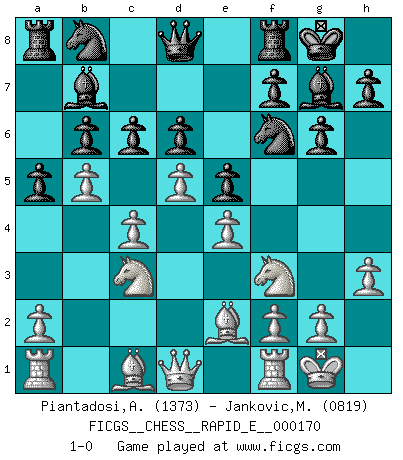Last move : 1-0 2016 June 9 22:21:58 [Event "FICGS__CHESS__RAPID_E__000170"] [Site "FICGS"] [Date "2016.03.08"] [Round "1"] [White "Piantadosi,Angelo"] [Black "Jankovic,Mladen"] [Result "1-0"] [WhiteElo "1373"] [BlackElo "0819"] 1.d4 Nf6 2.c4 g6 3.Nc3 Bg7 4.e4 O-O 5.Nf3 d6 6.Be2 e5 7.O-O b6 8.h3 Bb7 9.d5 c6 10.b4 a5 11.b5 1-0 This chess game has been lost on time (started : 2016.03.08 10:1:6) King's Indian : 4.e4 Kingside Castling by player Black (move 4) Kingside Castling by player White (move 7) Player White won this chess game. Follow this game move after move (download)Strategy requires thought, tactics require observation. (Max Euwe) Die Arbeit ist etwas Unnatürliches. Die Faulheit allein ist göttlich. (Anatole France) No hay precio que no valga la pena por la cabellera del Rey enemigo. (Koblentz) Dieu déplace le joueur, et celui-ci la pièce. Quel Dieu derrière Dieu commence donc la trame ? Arturo Perez-Reverte (prix de littérature policière 1993). In every real man a child is hidden that wants to play. (Friedrich Nietzsche)