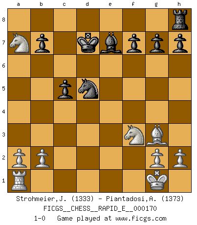 Last move : 1-0 2016 May 30 0:15:14 [Event "FICGS__CHESS__RAPID_E__000170"] [Site "FICGS"] [Date "2016.03.08"] [Round "1"] [White "Strohmeier,Josef"] [Black "Piantadosi,Angelo"] [Result "1-0"] [WhiteElo "1333"] [BlackElo "1373"] 1.e4 Nf6 2.e5 Nd5 3.d4 d6 4.c4 Nb6 5.f4 dxe5 6.fxe5 e6 7.Nf3 c5 8.d5 exd5 9.cxd5 Qxd5 10.Bb5+ Bd7 11.Bxd7+ N8xd7 12.O-O Qxd1 13.Rxd1 O-O-O 14.Nc3 Kc7 15.Nb5+ Kb8 16.Bf4 Be7 17.e6 Kc8 18.exd7+ Rxd7 19.Rxd7 Kxd7 20.Nxa7 Nd5 21.Bg3 1-0 Alekhine's defense : Four pawns attack Kingside Castling by player White (move 12) Queenside Castling by player Black (move 13) Player White won this chess game. Follow this game move after move (download)Weak points or holes in the opponent's position must be occupied by pieces not Pawns. (Siegbert Tarrasch) Zu meiner Zeit war ein 20 jähriger ein junger Spieler, heute ist er ein Veteran. (Garry Kasparov) El Ajedrez, como cualquier otra actividad creativa, puede existir solo a través de méritos combinados de aquellos que tienen talento creativo y de aquellos que tienen la habilidad de organizar un trabajo creativo. (Mikhail Botvinnik) Le thème de l'attaque double intervient d'une manière ou d'une autre dans l'immense majorité des combinaisons. (Youri Averbakh) Macintosh - we might not get everything right, but at least we knew the century was going to end. (Douglas Adams)