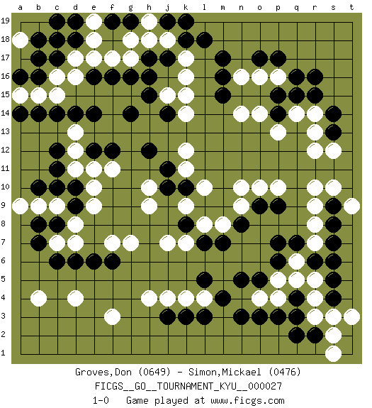 Last move : 1-0 2007 October 11 18:8:41 [Event "FICGS__GO__TOURNAMENT_KYU__000027"] [Site "FICGS"] [Date "2007.03.22"] [Round "1"] [Black "Groves,Don"] [White "Simon,Mickael"] [Result "1-0"] [Rating 1 "0649"] [Rating 2 "0476"] 1.q4 d16 2.r16 d4 3.p17 r10 4.r6 k17 5.c10 k4 6.c14 f17 7.c6 f3 8.n3 r13 9.m17 r8 10.c17 c16 11.b16 b15 12.b18 c15 13.a16 a15 14.b14 d17 15.d18 e18 16.d19 e19 17.e14 a18 18.e6 k15 19.m15 e10 20.g14 f7 21.d6 k12 22.g16 g17 23.p7 d8 24.c8 d12 25.c12 d13 26.d14 d11 27.c11 c7 28.b7 c9 29.b8 b9 30.b10 a9 31.d9 e9 32.d10 d7 33.f12 f11 34.e12 e11 35.h12 h10 36.j14 k14 37.j11 k11 38.j10 h9 39.k10 l10 40.k8 l8 41.l7 m8 42.m7 j7 43.n8 k7 44.l5 l4 45.m4 k9 46.p9 p16 47.q16 o16 48.o17 n14 49.e16 e17 50.f16 b4 51.s7 r3 52.q3 r4 53.r2 s2 54.q2 r5 55.s5 q6 56.q7 r7 57.s6 q5 58.s9 r9 59.s8 s10 60.s4 s3 61.p6 p5 62.o5 n9 63.o9 n10 64.b17 b19 65.c18 o10 66.p15 n16 67.m16 o14 68.p14 p13 69.s14 r14 70.r15 p10 71.h17 h18 72.j17 j18 73.l18 j15 74.h15 o4 75.n5 p4 76.o3 t3 77.p3 s1 78.l3 t9 79.k3 j4 80.j3 h4 81.f6 g7 82.s13 r12 83.k18 k16 84.h16 q14 85.q15 s12 86.g19 g18 87.f19 a19 88.a14 a17 89.c19 a18 90.j19 h19 91.k19 1-0 Here are the names of the openings (joseki) played in the four corners : Corner d16 : d16 c14 Hoshi (Hwajeom, Seongjeom, Xingwei`) 4-4 Point. The star or hoshi (4-4) point, emphasizing influence at the potential expense of territory. Ikken Kakari (Hankan Keolch'im, Yi Gua`jiao~, 1-Space Low Approach). Black 2 is the standard approach move to the 4-4. Corner d4 : d4 c6 Hoshi (Hwajeom, Seongjeom, Xingwei`) 4-4 Point. The star or hoshi (4-4) point, emphasizing influence at the potential expense of territory. Ikken Kakari (Hankan Keolch'im, Yi Gua`jiao~, 1-Space Low Approach). Black 2 is the standard approach move to the 4-4. Player Black won this Go (weiqi, baduk) game. Follow this game move after move (download)Go is to western chess what philosophy is to double entry accounting. (from Shibumi, by Trevanian) Wipe them out. All of them. (Darth Sidious in Star Wars ep.1)