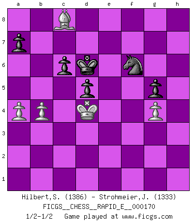 Last move : 1/2-1/2 2016 August 1 0:34:32 [Event "FICGS__CHESS__RAPID_E__000170"] [Site "FICGS"] [Date "2016.03.08"] [Round "1"] [White "Hilbert,Stephan J."] [Black "Strohmeier,Josef"] [Result "1/2-1/2"] [WhiteElo "1386"] [BlackElo "1333"] 1.Nh3 d5 2.g3 e5 3.f4 Bd6 4.fxe5 Bxe5 5.Bg2 c6 6.O-O Nf6 7.d4 Bd6 8.Bg5 Nbd7 9.Nd2 h6 10.Bf4 Nb6 11.e4 Bxf4 12.Nxf4 O-O 13.e5 Nh7 14.Qh5 Qg5 15.Nf3 Qxh5 16.Nxh5 Bg4 17.Nf4 Nc4 18.Rfe1 Rfe8 19.b3 Bxf3 20.Bxf3 Nd2 21.Bg2 Ng5 22.Re2 Nde4 23.c4 Rad8 24.Rc1 Rc8 25.c5 f6 26.exf6 Nxf6 27.Rce1 Rxe2 28.Rxe2 Kf7 29.h4 Nge4 30.Bh3 Re8 31.Kg2 g5 32.hxg5 hxg5 33.Nd3 Kg7 34.Bf5 Nc3 35.Rxe8 Nxe8 36.a3 Nb5 37.a4 Nxd4 38.Bd7 Nf6 39.Bc8 b6 40.b4 bxc5 41.Nxc5 Ne8 42.Ne6+ Nxe6 43.Bxe6 Nf6 44.Kf3 Kf8 45.Bf5 Ke7 46.g4 Kd6 47.Ke3 Ke5 48.Bc8 Kd6 49.Kd4 Kc7 50.Bf5 Kd6 51.Bc8 Ne4 52.Bf5 Nf6 53.Bc8 1/2-1/2 Amar (Paris) Opening Kingside Castling by player White (move 6) Kingside Castling by player Black (move 12) This chess game ended in a draw. Follow this game move after move (download)A good player is always lucky. (Jose Raul Capablanca) Über Karpov: Er war und ist ein Vertreter der russischen Reaktionäre. Das steckt tief in seiner Seele, wehalb ich nicht nett mit ihm umgehen kann. (Viktor Kortschnoi) Hoy en día, si tu no eres un Gran Maestro a los 14 años, es mejor que lo olvides. (Anand Viswanathan) Le pion, dans sa simplicité, marche droit devant lui, mais lorsqu'il prend, il le fait obliquement? Ainsi l'homme, tant qu'il reste pauvre, marche dans la droiture et vit honnêtement, mais lorsqu'il recherche les honneurs, il flatte, se parjure et, par les voies obliques, cherche une position supérieure sur l'échiquier du monde. (Jean de Galles) Art is not a thing, it is a way. (Elbert Hubbard)