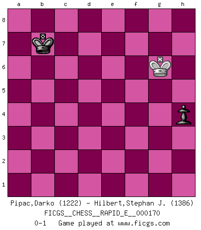 Last move : 0-1 2016 April 13 17:5:29 [Event "FICGS__CHESS__RAPID_E__000170"] [Site "FICGS"] [Date "2016.03.08"] [Round "1"] [White "Pipac,Darko"] [Black "Hilbert,Stephan J."] [Result "0-1"] [WhiteElo "1222"] [BlackElo "1386"] 1.e4 e5 2.Nf3 Nc6 3.d4 exd4 4.Nxd4 Bc5 5.Nxc6 bxc6 6.Nc3 d6 7.Qf3 Nf6 8.e5 Ng4 9.Qxc6+ Bd7 10.Qf3 Nxf2 11.Ne4 Nxh1 12.exd6 cxd6 13.Nxc5 dxc5 14.Be3 O-O 15.O-O-O Qc7 16.a3 Qxh2 17.Rxd7 Ng3 18.Bxc5 Nxf1 19.Bxf8 Qh6+ 20.Kd1 Ne3+ 21.Ke2 Rxf8 22.Qxe3 Qc6 23.Rxa7 Re8 24.Re7 Qxc2+ 25.Kf3 Qf5+ 26.Ke2 Qb5+ 27.Kf3 Qc6+ 28.Kg4 Qg6+ 29.Kf3 Qf6+ 30.Ke2 Rxe7 31.Qxe7 Qxe7+ 32.Kd3 Qf6 33.Kc2 Qf2+ 34.Kc3 Kf8 35.b4 Ke7 36.Kc4 Kd6 37.Kb5 Qe2+ 38.Ka5 Qc2 39.a4 Qc7+ 40.Kb5 Qc6+ 41.Ka5 f5 42.b5 Qc3+ 43.Ka6 Kc7 44.a5 Qf6+ 45.b6+ Kb8 46.g4 f4 47.Kb5 f3 48.a6 f2 49.g5 Qe7 50.a7+ Qxa7 51.bxa7+ Kxa7 52.Kc6 f1Q 53.Kd6 Qc4 54.Ke7 h5 55.Kf8 Qe6 56.g6 Kb7 57.Kxg7 Qxg6+ 58.Kxg6 h4 0-1 Scotch game Kingside Castling by player Black (move 14) Queenside Castling by player White (move 15) 10 pieces endgame at move 31 : White KQPPP , Black KQPPP WHITE : King + 1 Queen 3 Pawns BLACK : King + 1 Queen 3 Pawns 9 pieces endgame at move 31 : White KPPP , Black KQPPP WHITE : King + 3 Pawns BLACK : King + 1 Queen 3 Pawns 8 pieces endgame at move 50 : White KPP , Black KQPPP WHITE : King + 2 Pawns BLACK : King + 1 Queen 3 Pawns 7 pieces endgame at move 51 : White KPP , Black KPPP WHITE : King + 2 Pawns BLACK : King + 3 Pawns 6 pieces endgame at move 51 : White KP , Black KPPP WHITE : King + 1 Pawn BLACK : King + 3 Pawns Promotion Queen by player Black (move 52) 5 pieces endgame at move 57 : White KP , Black KQP WHITE : King + 1 Pawn BLACK : King + 1 Queen 1 Pawn 4 pieces endgame at move 57 : White K , Black KQP WHITE : King + BLACK : King + 1 Queen 1 Pawn 3 pieces endgame at move 58 : White K , Black KP WHITE : King + BLACK : King + 1 Pawn Player Black won this chess game. Follow this game move after move (download)Chess is above all, a fight ! (Emanuel Lasker) Ein Kibitz ist einer, der deinem Gegner gute Ratschläge gibt. (Andrew Soltis) No es una movida, aún la mejor movida que tu debas buscar, sino un plan comprensible. (Eugene Znosko-Borovsky) Ce qui caractérise les parties de combat, c'est que si le défenseur a constamment de difficiles problèmes à résoudre, l'attaquant doit chercher sans relâche de nouvelles possibilités d'attaque. (Koblentz) The arrogant army will lose certainly the battle. (Chinese proverb)