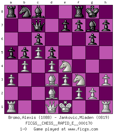 Last move : 1-0 2016 June 8 22:22:35 [Event "FICGS__CHESS__RAPID_E__000170"] [Site "FICGS"] [Date "2016.03.08"] [Round "1"] [White "Bromo,Alexis"] [Black "Jankovic,Mladen"] [Result "1-0"] [WhiteElo "1088"] [BlackElo "0819"] 1.d4 Nf6 2.c4 g6 3.e3 Bg7 4.Nc3 O-O 5.Nf3 c6 6.h3 Qa5 7.Bd2 d5 8.c5 Qc7 9.Bd3 b5 10.b4 a5 11.a3 Ne4 12.Nxe4 1-0 This chess game has been lost on time (started : 2016.03.08 10:1:6) King's Indian defense Kingside Castling by player Black (move 4) Player White won this chess game. Follow this game move after move (download)When you absolutely don't know what to do anymore, it is time to panic. (John van der Wiel) Der Freibauer hat für mich eine Seele, genau wie der Mensch, Wünsche, die unerkannt in ihm schlummern, und Befürchtungen, von deren Existenz er selbst kaum ahnt. (Aaron Nimzowitsch) El jugador táctico debe saber que hacer cuando algo se debe de hacer. El estratégico debe saber que hacer cuando nada se debe de hacer. (Savielly Tartakover) Je ne crois pas en la psychologie, je crois aux bons coups. (Robert Fischer) No, I am still playing. (Anatoly Karpov)
