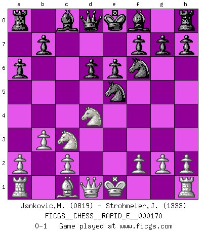 Last move : 0-1 2016 June 14 22:49:55 [Event "FICGS__CHESS__RAPID_E__000170"] [Site "FICGS"] [Date "2016.03.08"] [Round "1"] [White "Jankovic,Mladen"] [Black "Strohmeier,Josef"] [Result "0-1"] [WhiteElo "0819"] [BlackElo "1333"] 1.e4 c5 2.Nf3 Nc6 3.d4 cxd4 4.Nxd4 Nf6 5.Nc3 e6 6.Ndb5 d6 7.Bc4 a6 8.e5 Nxe5 9.Nd4 Nxc4 10.b3 Ne5 0-1 This chess game has been lost on time (started : 2016.03.08 10:1:6) Sicilian defense Player Black won this chess game. Follow this game move after move (download)If I win a tournament, I win it by myself. I do the playing. Nobody helps me. (Bobby Fischer) Die meiste Zeit treffe ich auf Gegner, die meine Enkel sein könnten. Ich bin da, um ihnen zu zeigen, dass sie von mir noch einiges lernen können. (Viktor Kortschnoi) Algunos sacrificios son sólidos, los demás son míos. (Mikhail Tal) On a dit que l'homme se distingue de l'animal par le fait qu'il achète plus de livres qu'il ne peut en lire. Je voudrais suggérer qu'inclure à la liste des livres quelques livres d'échecs rendrait la distinction manifeste. (Edward Lasker) May I never be complete. May I never be content. May I never be perfect. Deliver me, Tyler, from being perfect and complete. (Chuck Palahniuk, Fight Club)