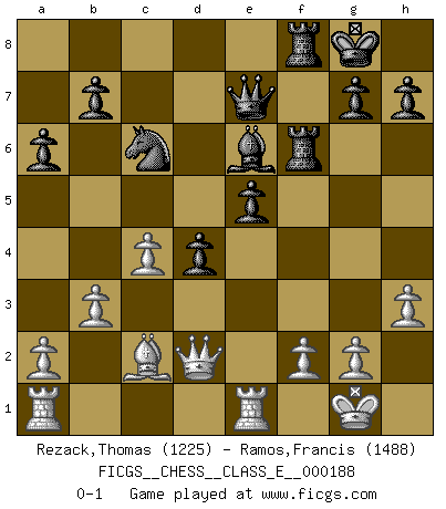 Last move : 0-1 2016 July 31 17:9:11 [Event "FICGS__CHESS__CLASS_E__000188"] [Site "FICGS"] [Date "2016.03.09"] [Round "1"] [White "Rezack,Thomas"] [Black "Ramos,Francis"] [Result "0-1"] [WhiteElo "1225"] [BlackElo "1488"] 1.e4 c5 2.Nf3 d6 3.d4 cxd4 4.Nxd4 Nf6 5.Nc3 a6 6.Be3 Ng4 7.Bf4 e5 8.h3 exd4 9.Nd5 Ne5 10.Be2 Nbc6 11.O-O Be6 12.c4 Be7 13.Nxe7 Qxe7 14.Qd2 O-O 15.b3 Rac8 16.Rfe1 f5 17.Bxe5 dxe5 18.exf5 Rxf5 19.Bd3 Rf6 20.Bc2 Rcf8 0-1 Sicilian : Najdorf, Byrne (English) attack Kingside Castling by player White (move 11) Kingside Castling by player Black (move 14) Player Black won this chess game. Follow this game move after move (download)Everything is in a state of flux, and this includes the world of Chess. (Mikhail Botvinnik) Die starken Figuren des Gegners muss man abtauschen. (José Raúl Capablanca) El Ajedrez, como la música, como el amor, tiene el poder de hacer feliz a la gente. (Siegbert Tarrasch) Dieu déplace le joueur, et celui-ci la pièce. Quel Dieu derrière Dieu commence donc la trame ? Arturo Perez-Reverte (prix de littérature policière 1993). The best weapon against an enemy is another enemy. (Friedrich Nietzsche)