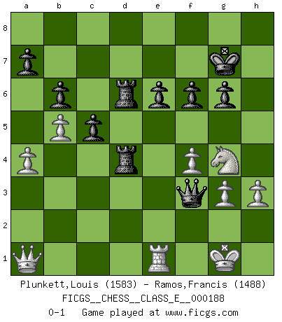 Last move : 0-1 2016 September 19 19:30:3 [Event "FICGS__CHESS__CLASS_E__000188"] [Site "FICGS"] [Date "2016.03.09"] [Round "1"] [White "Plunkett,Louis"] [Black "Ramos,Francis"] [Result "0-1"] [WhiteElo "1583"] [BlackElo "1488"] 1.c4 Nf6 2.g3 g6 3.Bg2 Bg7 4.Nc3 O-O 5.Rb1 d6 6.b4 c6 7.b5 Qc7 8.d3 Bd7 9.a4 e6 10.Bd2 d5 11.Nf3 b6 12.Bf4 Qd8 13.Qd2 c5 14.O-O Bc8 15.Bg5 Bb7 16.Ne5 h6 17.Bxh6 Nbd7 18.Nxd7 Qxd7 19.Bxg7 Kxg7 20.f4 Rad8 21.Nd1 Rh8 22.Bf3 dxc4 23.Bxb7 Qxb7 24.Qc3 cxd3 25.exd3 Rd4 26.Nf2 Qf3 27.Rbe1 Nd5 28.Qc1 Qh5 29.h3 Nb4 30.Re5 Qf3 31.Re3 Qd5 32.Qb2 Rd8 33.Ng4 f6 34.Rfe1 Rd6 35.Re4 Nxd3 36.Qa1 Nxe1 37.Rxe1 Qf3 0-1 English, 1...Nf6 (Anglo-Indian defense) Kingside Castling by player Black (move 4) Kingside Castling by player White (move 14) Player Black won this chess game. Follow this game move after move (download)At this time Fischer is simply a level above all the best Chessplayers in the world. (John Jacobs) Im Schach gibt es keinen Platz für Galanterie. (Irving Chernev) Durante una competencia de Ajedrez, un Maestro de Ajedrez deberá ser una combinación de presa de caza y un Monge. (Alexander Alekhine) La solitude du joueur d'Echecs à l'approche du mat est semblable à celle du condamné. (Francis Szpiner) Plans are ideas that never come to fruition. (Daniel Parmet)