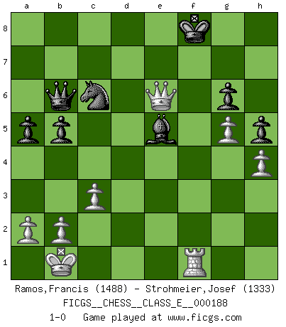 Last move : 1-0 2016 August 3 22:29:38 [Event "FICGS__CHESS__CLASS_E__000188"] [Site "FICGS"] [Date "2016.03.09"] [Round "1"] [White "Ramos,Francis"] [Black "Strohmeier,Josef"] [Result "1-0"] [WhiteElo "1488"] [BlackElo "1333"] 1.e4 c5 2.Nf3 e6 3.d4 cxd4 4.Nxd4 Nf6 5.Nc3 Nc6 6.Bg5 Be7 7.f4 h6 8.Bxf6 Bxf6 9.e5 Be7 10.Ndb5 O-O 11.Nd6 a6 12.Qd2 f6 13.O-O-O fxe5 14.Kb1 exf4 15.Bc4 Qc7 16.Nce4 b5 17.Bb3 Nd8 18.Nxc8 Rxc8 19.g4 d5 20.Nf2 Kh8 21.h4 g6 22.g5 h5 23.Rhe1 Rf5 24.Qd4+ Kh7 25.c3 Bc5 26.Qd2 Be3 27.Qe2 Qb6 28.Nd3 a5 29.Bc2 Nc6 30.Nxf4 Bxf4 31.Qxe6 Rcf8 32.Bxf5 Rxf5 33.Qd7+ Kg8 34.Re8+ Rf8 35.Qxd5+ Kg7 36.Rxf8 Kxf8 37.Qe6 Be5 38.Rf1+ 1-0 Sicilian : Anderssen variation Kingside Castling by player Black (move 10) Queenside Castling by player White (move 13) Player White won this chess game. Follow this game move after move (download)All that matters on the Chessboard is good moves. (Bobby Fischer) Es macht mich traurig, wenn ich sehe, dass Golfprofis mehr verdienen als Schachsportler. Obwohl ich davon überzeugt bin, dass wir Schachspieler viel härter trainieren müssen als die Golfer. (Alexandra Kosteniuk) Ser exitoso en el Ajedrez te permite descubrir tu propia personalidad. Eso es lo que deseo para los niños de mi clase. (Saudin Robovic) D'abord les bases : Jouez et étudiez, puis étudiez et jouez, ensuite jouez et étudiez, puis étudiez et jouez. Deuxièmement : Donnez toujours le meilleur de vous-même ! (Ken Smith) After growing wildly for years, the field of computing appears to be reaching its infancy. (John Pierce)
