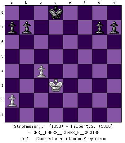 Last move : 0-1 2016 August 2 11:34:22 [Event "FICGS__CHESS__CLASS_E__000188"] [Site "FICGS"] [Date "2016.03.09"] [Round "1"] [White "Strohmeier,Josef"] [Black "Hilbert,Stephan J."] [Result "0-1"] [WhiteElo "1333"] [BlackElo "1386"] 1.e4 e5 2.Nf3 f5 3.Nxe5 Qf6 4.d4 d6 5.Nc4 fxe4 6.Nc3 Qg6 7.Qe2 Nf6 8.f3 Bf5 9.Nd2 Be7 10.Ndxe4 Nxe4 11.Nxe4 O-O 12.c3 Nd7 13.Bd2 Rae8 14.O-O-O Nb6 15.b3 Bd8 16.c4 Bxe4 17.fxe4 Rxe4 18.Qd3 Bf6 19.Bc3 Rfe8 20.g3 d5 21.Bg2 dxc4 22.bxc4 Bg5+ 23.Kb1 Na4 24.Bxe4 Nxc3+ 25.Qxc3 Qxe4+ 26.Qd3 Qc6 27.Rhf1 Re3 28.Qc2 Bf6 29.Rd3 Qb6+ 30.Kc1 Bxd4 31.Rxe3 Bxe3+ 32.Kd1 Qd4+ 33.Ke2 Bg1 34.Rf4 Qe5+ 35.Re4 Qh5+ 36.Ke1 Bxh2 37.Qf2 Bxg3 38.Qxg3 Qh1+ 39.Kf2 Qxe4 40.Qxc7 Qf5+ 41.Ke3 Qe6+ 42.Kd3 Qc6 43.Qb8+ Kf7 44.Qf4+ Qf6 45.Qc7+ Qe7 46.Qf4+ Ke8 47.Qb8+ Qd8+ 48.Qxd8+ Kxd8 0-1 Latvian counter-gambit Kingside Castling by player Black (move 11) Queenside Castling by player White (move 14) 10 pieces endgame at move 40 : White KQPP , Black KQPPPP WHITE : King + 1 Queen 2 Pawns BLACK : King + 1 Queen 4 Pawns 9 pieces endgame at move 48 : White KQPP , Black KPPPP WHITE : King + 1 Queen 2 Pawns BLACK : King + 4 Pawns 8 pieces endgame at move 48 : White KPP , Black KPPPP WHITE : King + 2 Pawns BLACK : King + 4 Pawns Player Black won this chess game. Follow this game move after move (download)You may learn much more from a game you lose than from a game you win. You will have to lose hundreds of games before becoming a good player. (Jose Raul Capablanca) Wenn du gegen Bobby spielst, ist es keine Frage von gewinnen oder verlieren. Es ist eine Frage des Überlebens. (Boris Vassilievich Spassky) Nos gusta pensar. (Gary Kasparov) Toutes choses étant égales, c'est la conviction qui gagne. Alliée à une volonté de vaincre, elle sert de détonateur, suscite des idées, disperse les doutes et aide à penser clairement. (Robert Fischer) Nowadays, anyone who cannot speak English and is incapable of using the Internet is regarded as backward. (Al-Waleed bin Talal)
