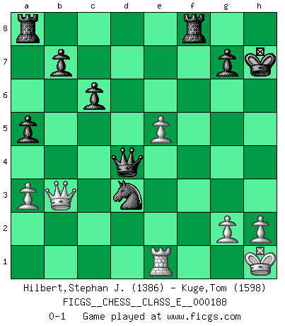 Last move : 0-1 2016 March 29 9:21:37 [Event "FICGS__CHESS__CLASS_E__000188"] [Site "FICGS"] [Date "2016.03.09"] [Round "1"] [White "Hilbert,Stephan J."] [Black "Kuge,Tom"] [Result "0-1"] [WhiteElo "1386"] [BlackElo "1598"] 1.e4 e5 2.Nf3 Nf6 3.Nxe5 d6 4.Nxf7 Kxf7 5.d4 Bg4 6.f3 Be6 7.Bd3 Be7 8.O-O Rf8 9.c4 Kg8 10.Nc3 Nbd7 11.Be3 c6 12.f4 Nb6 13.b3 d5 14.e5 Ng4 15.Qd2 Bb4 16.a3 Bxc3 17.Qxc3 Nxe3 18.Rf3 dxc4 19.Bxh7+ Kxh7 20.Qxe3 Nd5 21.Qf2 cxb3 22.Qg3 a5 23.Rxb3 Nxf4 24.Re1 Bxb3 25.Qxb3 Qxd4+ 26.Kh1 Nd3 0-1 Petrov : Cochrane gambit Kingside Castling by player White (move 8) Player Black won this chess game. Follow this game move after move (download)There's never before been a Chess player with such a thorough knowledge of the intricacies of the game and such an absolutely indomitable will to win. I think Bobby is the greatest player that ever lived. (Lisa Lane) Obendrein hat der FIDE-Präsident den Revolutionsführer Gaddafi zum »Großmeister« ernannt, am Ende der WM. Das ist lächerlich! (Joel Lautier) Es muy difícil jugar en contra de la teoría de Einstein. - en su primera derrota en contra de Fischer (Mikhail Tal) Il (Jacob Murray) ne joue pas pour le bon coup, mais pour le meilleur. (Eloi Relange) Men never do evil so completely and cheerfully as when they do it from religious conviction. (Blaise Pascal)