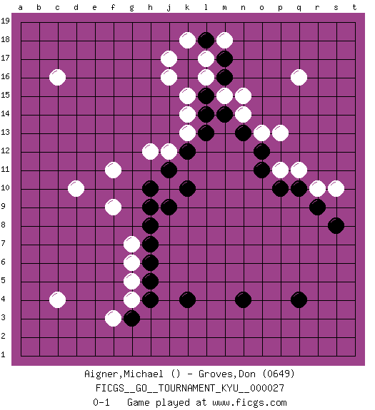 Last move : 0-1 2007 May 12 18:45:34 [Event "FICGS__GO__TOURNAMENT_KYU__000027"] [Site "FICGS"] [Date "2007.03.22"] [Round "1"] [Black "Aigner,Michael"] [White "Groves,Don"] [Result "0-1"] [Rating 2 "0649"] 1.q4 c4 2.k4 f3 3.g3 g4 4.h4 g5 5.h5 c16 6.n4 q16 7.k10 r10 8.q10 q11 9.p10 p11 10.o11 p13 11.r9 s10 12.s8 j17 13.k16 k14 14.l15 k15 15.l14 k13 16.l13 d10 17.o12 o13 18.n13 n14 19.m14 n15 20.k12 j12 21.j11 h12 22.h10 f11 23.h9 j16 24.h6 g6 25.h7 g7 26.h8 f9 27.j9 l16 28.m16 l17 29.k17 m15 30.l18 k18 31.m17 m18 0-1 Here are the names of the openings (joseki) played in the four corners : Player White won this Go (weiqi, baduk) game. Follow this game move after move (download)There are possible things, impossible things, and things that happen. Sometimes things happen that were impossible. (Pierre Audouard) Knowledge will give you power, but character respect. (Bruce Lee)