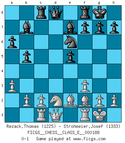 Last move : 0-1 2016 July 29 4:16:23 [Event "FICGS__CHESS__CLASS_E__000188"] [Site "FICGS"] [Date "2016.03.09"] [Round "1"] [White "Rezack,Thomas"] [Black "Strohmeier,Josef"] [Result "0-1"] [WhiteElo "1225"] [BlackElo "1333"] 1.e4 c5 2.Nf3 d6 3.d4 cxd4 4.Nxd4 Nf6 5.Nc3 a6 6.Be3 e5 7.Nf3 Be7 8.Be2 O-O 9.O-O b5 10.a3 Bb7 11.Nd2 Nbd7 12.f3 Rc8 13.Bf2 d5 14.exd5 Nxd5 15.Nxd5 Bxd5 16.Rc1 Bb7 17.Bd3 Nc5 18.Be2 Ne6 0-1 Sicilian : Najdorf, Byrne (English) attack Kingside Castling by player Black (move 8) Kingside Castling by player White (move 9) Player Black won this chess game. Follow this game move after move (download)If your opponent offers you a draw, try to work out why he thinks he's worse off. (Nigel Short) Ich habe die Schachforschung dermaßen betrieben, dass sie auf eine wissenschaftliche Basis gestellt wurde. (Mikhail Moiseyevich Botvinik) El hombre es un frívolo, una creatura engañosa y como un jugador de Ajedrez, se preocupa mas por el proceso de obtener su meta que de la meta por sí misma. (Dostoyevsky) La menace est plus forte que l'exécution. (Aaron Nimzovitch) Humor is by far the most significant activity of the human brain. (Edward De Bono)