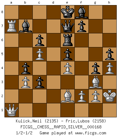 Last move : 1/2-1/2 2016 March 23 10:16:55 [Event "FICGS__CHESS__RAPID_SILVER__000168"] [Site "FICGS"] [Date "2016.03.10"] [Round "2"] [White "Kulick,Neil"] [Black "Fric,Lubos"] [Result "1/2-1/2"] [WhiteElo "2135"] [BlackElo "2158"] 1.d4 d5 2.c4 c6 3.Nf3 Nf6 4.Nc3 e6 5.Bg5 h6 6.Bh4 dxc4 7.e4 g5 8.Bg3 b5 9.Be2 Bb7 10.h4 g4 11.Ne5 Nbd7 12.Nxd7 Qxd7 13.Be5 Qe7 14.O-O Rg8 15.b3 Nd7 16.Bg3 b4 17.Na4 c3 18.a3 a5 19.Qc2 h5 20.Rfd1 Rg6 21.Nc5 Nxc5 22.dxc5 Rd8 23.axb4 axb4 24.Ra7 Rxd1+ 25.Qxd1 e5 26.Kh2 Re6 27.Qa1 1/2-1/2 QGD Slav : 4.Nc3 Kingside Castling by player White (move 14) This chess game ended in a draw. Follow this game move after move (download)Whoever sees no other aim in the game than that of giving checkmate to one's opponent will never become a good Chess player. (Euwe) Wer sich die Fähigkeit anerziehen will im Schach selbstständig zu denken, der muß alles meiden, was leblos ist: ausgeklügelte Theorien, die sich auf sehr wenige Beispiele und eine Menge Hirngespinste stützen. (Emanuel Lasker) No existe un remordimiento como el remordimiento del Ajedrez. (H. G. Wells) Des idées, des idées, j'en ai cent, j'en ai mille. Des bonnes, des mauvaises, applicables, irréalisables... Il suffit de faire le tri ! (Roos) If you lose the game you should win the analysis! (Proverb)