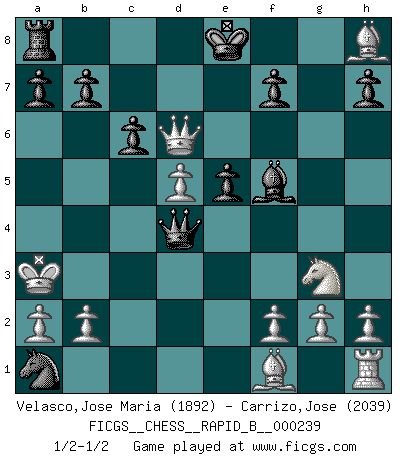 Last move : 1/2-1/2 2016 March 16 20:7:49 [Event "FICGS__CHESS__RAPID_B__000239"] [Site "FICGS"] [Date "2016.03.11"] [Round "1"] [White "Velasco,Jose Maria"] [Black "Carrizo,Jose"] [Result "1/2-1/2"] [WhiteElo "1892"] [BlackElo "2039"] 1.d4 d5 2.c4 e6 3.Nc3 c6 4.e4 dxe4 5.Nxe4 Bb4+ 6.Bd2 Qxd4 7.Bxb4 Qxe4+ 8.Ne2 Na6 9.Bf8 Ne7 10.Bxg7 Nb4 11.Bxh8 e5 12.Qd6 Nc2+ 13.Kd2 Bf5 14.Ng3 Qf4+ 15.Kc3 Nd5+ 16.cxd5 Qd4+ 17.Kb3 Nxa1+ 18.Ka3 1/2-1/2 QGD : Semi-Slav, Marshall gambit This chess game ended in a draw. Follow this game move after move (download)Best by test: 1. e4 (Bobby Fischer) Oft bringt ein stiller Zug das Erdbeben. (Richard Reti) Botvinnik trató de alejar el misterio referente al Ajedrez, siempre relacionandolo a situaciones de la vida diaria. Solía llamar al Ajedrez un problema inexacto típico, similar a aquellos en que la gente tiene siempre que resolver a cada día. (Garry Kasparov) Les Echecs sont et restent toujours un combat, un combat intégral comme la boxe, la lutte ou un autre sport, et où il doit y avoir un vainqueur et un vaincu. (Joseph Emil Diemer) He who laughs last probably does not get the joke. (Unknown)