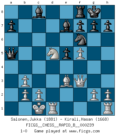 Last move : 1-0 2016 June 15 23:1:44 [Event "FICGS__CHESS__RAPID_B__000239"] [Site "FICGS"] [Date "2016.03.11"] [Round "1"] [White "Salonen,Jukka"] [Black "Kirali,Hasan"] [Result "1-0"] [WhiteElo "1881"] [BlackElo "1668"] 1.e4 c5 2.Nf3 e6 3.d4 cxd4 4.Nxd4 Nc6 5.Nc3 d6 6.Be3 Nf6 7.f4 Be7 8.Qf3 e5 9.Nxc6 bxc6 10.f5 Qa5 11.O-O-O O-O 12.Bc4 Rb8 13.Bb3 d5 14.exd5 Rxb3 15.axb3 cxd5 16.Nxd5 1-0 This chess game has been lost on time (started : 2016.03.11 10:2:19) Sicilian : Taimanov variation Queenside Castling by player White (move 11) Kingside Castling by player Black (move 11) Player White won this chess game. Follow this game move after move (download)Pawns are born free, yet they are everywhere in chains. (Rick Kennedy) Jeder Schachmeister war einmal ein Anfänger. (Irving Chernev) Botvinnik trataba de restarle el misterio al Ajedrez, siempre relacionandolo a situaciones de la vida ordinaria. El gustaba de llamar al Ajedrez un típico problema inexacto similar a aquellos de los cuales la gente siempre tiene que enfrentarse en la vida cotidiana. (Garry Kasparov) Aucun coup ne doit être joué sans but. (Pedro Damiano) Those parts of the system that you can hit with a hammer (not advised) are called hardware; those program instructions that you can only curse at are called software. (Anonymous)