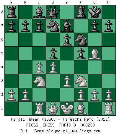 Last move : 0-1 2016 July 12 1:29:17 [Event "FICGS__CHESS__RAPID_B__000239"] [Site "FICGS"] [Date "2016.03.11"] [Round "1"] [White "Kirali,Hasan"] [Black "Pareschi,Remo"] [Result "0-1"] [WhiteElo "1668"] [BlackElo "2021"] 1.d4 f5 2.c4 Nf6 3.Nc3 e6 4.Nf3 d5 5.Bg5 Be7 6.e3 O-O 7.Rc1 Nbd7 0-1 This chess game has been lost on time (started : 2016.03.11 10:2:19) Dutch with c4 & Nc3 Kingside Castling by player Black (move 6) Player Black won this chess game. Follow this game move after move (download)When asked, -How is that you pick better moves than your opponents?, I responded: I'm very glad you asked me that, because, as it happens, there is a very simple answer. I think up my own moves, and I make my opponent think up his. (Alexander Alekhine) Wenn Dein Gegner dir ein Remis anbietet, versuch herauszufinden, weshalb er glaubt schlechter zu stehen. (Nigel Short) El Ajedrez es el arte del análisis. (Mikhail Botvinnik) Vous n'êtes pas toujours obligé de jouer le meilleur coup. Un coup doit être actif, entreprenant, correct et beau ! (David Bronstein) Whoever said the pen is mightier than the sword obviously never encountered automatic weapons. (US General Douglas MacArthur)