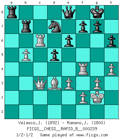 Last move : 1/2-1/2 2016 June 2 18:8:10 [Event "FICGS__CHESS__RAPID_B__000239"] [Site "FICGS"] [Date "2016.03.11"] [Round "1"] [White "Velasco,Jose Maria"] [Black "Romano,Jacopo"] [Result "1/2-1/2"] [WhiteElo "1892"] [BlackElo "1800"] 1.d4 Nf6 2.c4 e6 3.Nf3 b6 4.g3 Ba6 5.b3 b5 6.cxb5 Bxb5 7.Bg2 d5 8.O-O Nbd7 9.Nc3 Ba6 10.Re1 Bb4 11.Bd2 c5 12.a3 Bxc3 13.Bxc3 Ne4 14.Rc1 Nxc3 15.Rxc3 cxd4 16.Nxd4 Bb7 17.Nc6 Bxc6 18.Rxc6 Nf6 19.b4 O-O 20.Qd4 Qe7 21.Rec1 a5 22.Qb2 axb4 23.axb4 Rfb8 24.b5 Qd8 25.e3 Rb7 26.Bf1 Rab8 27.Bd3 h6 28.Rb1 Nd7 29.Kg2 Qf6 30.Qc2 Qd8 31.Qc3 Qe8 32.Be2 Nb6 33.Rb4 Qf8 34.Rg4 Ra8 35.Bd3 Nd7 36.Rf4 Qe8 37.h4 Qd8 38.Rg4 Qf8 39.Be2 Nb6 40.Rb4 Qd8 41.Rf4 Qe8 42.Bd3 Nd7 1/2-1/2 Queen's Indian : Nimzovich variation (exaggerated Fianchetto) Kingside Castling by player White (move 8) Kingside Castling by player Black (move 19) This chess game ended in a draw. Follow this game move after move (download)After a bad opening, there is hope for the middle game. After a bad middle game, there is hope for the endgame. But once you are in the endgame, the moment of truth has arrived. (Edmar Mednis) Schon mancher Spieler hat aufgegeben, um zu vermeiden, daß er eine Figur verliert. (Savielly Grigorievitsch Tartakower) Yo jugué Ajedrez con el y a veces le pude haber ganado solo que siempre devuelve su última jugada y juega la partida de manera diferente. (Mark Twain) Les erreurs sont comme les malheurs, elles n'arrivent jamais seules. (Siegbert Tarrasch) To err is human, to shift the blame on someone else is tactical. (Mladen Jankovic)
