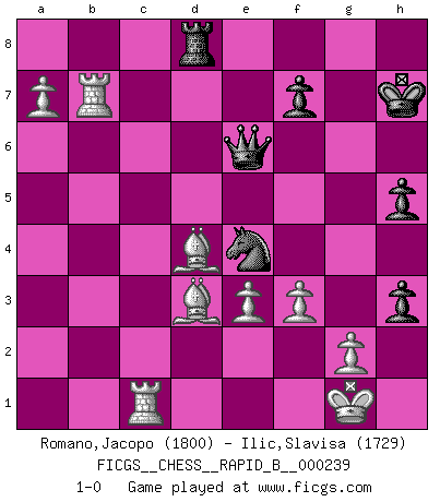 Last move : 1-0 2016 August 24 20:36:53 [Event "FICGS__CHESS__RAPID_B__000239"] [Site "FICGS"] [Date "2016.03.11"] [Round "1"] [White "Romano,Jacopo"] [Black "Ilic,Slavisa"] [Result "1-0"] [WhiteElo "1800"] [BlackElo "1729"] 1.d4 Nf6 2.c4 e6 3.Nc3 Bb4 4.e3 O-O 5.Nge2 d5 6.a3 Bd6 7.Ng3 b6 8.cxd5 exd5 9.Be2 Re8 10.O-O c6 11.b4 Nbd7 12.Bb2 a6 13.Qc2 Nf8 14.Nb1 Bd7 15.Nd2 a5 16.bxa5 Rxa5 17.a4 Qc7 18.Nf3 g6 19.Ne5 h5 20.Nxd7 N8xd7 21.Rfc1 Rc8 22.Bd3 Kg7 23.Nf1 Nf8 24.Qb3 Ne6 25.h3 Qd8 26.Qc2 Bb4 27.Qb3 Bd6 28.Nd2 c5 29.dxc5 bxc5 30.Rd1 c4 31.Bxc4 Nc5 32.Qb4 Nd3 33.Qxa5 Qxa5 34.Bxd3 Qb4 35.Bd4 Bc5 36.Be5 Bd6 37.Rab1 Qc5 38.Bd4 Qc7 39.Nf3 Ra8 40.Bb5 Ba3 41.Rd3 Be7 42.Rc3 Qd8 43.Ne5 Kg8 44.Nc6 Qd6 45.Nxe7+ Qxe7 46.Bc6 Rd8 47.R3c1 Ne4 48.a5 Nd2 49.Rb5 Qg5 50.Bxd5 Kh7 51.Bc6 Qe7 52.Rb7 Qe6 53.Bb5 g5 54.a6 g4 55.a7 gxh3 56.Bd3+ Ne4 57.f3 1-0 This chess game has been lost on time (started : 2016.03.11 10:2:19) Nimzo-Indian : 4.e3 O-O Kingside Castling by player Black (move 4) Kingside Castling by player White (move 10) Player White won this chess game. Follow this game move after move (download)A Chess game is divided into three stages: the first, when you hope you have the advantage, the second when you believe you have an advantage, and the third... when you know you're going to lose ! (Savielly Tartakower) Konzentriere dich auf materielle Gewinne. Nimm, was dir dein Gegner gibt, ausser es gibt einen guten Grund der dagegenspricht. (Robert James Fischer) Los libros de Ajedrez deben de usarse igual como usamos los anteojos: para mejorar la vista, aunque algunos jugadores los quieren usar como si ellos les otorgaran la vision. (José Raúl Capablanca) Les échecs sont utiles à l'exercice de la faculté de penser et à celle de l'imagination. Car nous devons posséder une méthode élaborée pour atteindre des buts partout où nous devons conduire notre raison. (Leibnitz) It's not enough to succeed. Others must fail. (Gore Vidal)