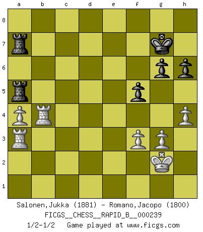 Last move : 1/2-1/2 2016 June 9 8:15:4 [Event "FICGS__CHESS__RAPID_B__000239"] [Site "FICGS"] [Date "2016.03.11"] [Round "1"] [White "Salonen,Jukka"] [Black "Romano,Jacopo"] [Result "1/2-1/2"] [WhiteElo "1881"] [BlackElo "1800"] 1.d4 Nf6 2.c4 e6 3.Nf3 b6 4.g3 Ba6 5.b3 b5 6.cxb5 Bxb5 7.Bg2 d5 8.O-O Nbd7 9.Nc3 Ba6 10.Re1 Bb4 11.Bd2 c5 12.a3 Bxc3 13.Bxc3 Ne4 14.Rc1 Nxc3 15.Rxc3 cxd4 16.Nxd4 Bb7 17.Qc2 Qb6 18.Rc7 Rd8 19.Rc1 O-O 20.Nc6 Bxc6 21.Qxc6 a5 22.Qxb6 Nxb6 23.R1c5 a4 24.b4 g6 25.e4 dxe4 26.Bxe4 Rd1+ 27.Kg2 Ra1 28.Rc3 f5 29.Bf3 Rf7 30.R7c6 Nd5 31.Bxd5 exd5 32.Ra6 Rd1 33.R3c6 d4 34.b5 d3 35.Rd6 Rb1 36.Rxd3 Rxb5 37.Rxa4 Kg7 38.Rd2 Rc5 39.Rb2 Kh6 40.Ra2 Kg5 41.h4+ Kh5 42.Rf4 Ra5 43.a4 Rb7 44.Kh3 Kh6 45.Rd4 Kg7 46.Rc2 Rba7 47.R2c4 Re5 48.Rd2 Rea5 49.Ra2 Kf6 50.Rb4 R7a6 51.Kg2 h6 52.Ra3 Kg7 53.f3 Ra7 1/2-1/2 Queen's Indian : Nimzovich variation (exaggerated Fianchetto) Kingside Castling by player White (move 8) Kingside Castling by player Black (move 19) This chess game ended in a draw. Follow this game move after move (download)The essence of Chess is thinking about what Chess is. (David Bronstein) Obendrein hat der FIDE-Präsident den Revolutionsführer Gaddafi zum »Großmeister« ernannt, am Ende der WM. Das ist lächerlich! (Joel Lautier) Un juego de Ajedrez es un dialogo, una conversación entre un jugador y su oponente. Cada movimiento del oponente puede contener amenazas o tropiezos, pero un jugador no se puede defender de las amenazas o tomar ventaja de los tropiezos si es que no se pregunta a sí mismo: ¿Que es lo que mi oponente va a hacer después de cada movida?. (Bruce A. Moon) Les réformistes prétendent que les progrès de la théorie conduiront à la disparition des échecs, et qu'il faut, pour leur rendre vie, en remanier les règles. En réalité, qu'exprime cette affirmation? Le mépris de l'intuition, de l'imagination et de tous les autres éléments qui font des échecs un art. (Alexander Alekhine) The worth of a book is to be measured by what you can carry away from it. (James Bryce)