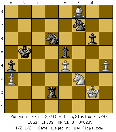 Last move : 1/2-1/2 2016 October 11 10:3:37 [Event "FICGS__CHESS__RAPID_B__000239"] [Site "FICGS"] [Date "2016.03.11"] [Round "1"] [White "Pareschi,Remo"] [Black "Ilic,Slavisa"] [Result "1/2-1/2"] [WhiteElo "2021"] [BlackElo "1729"] 1.d4 Nf6 2.c4 e6 3.Nc3 Bb4 4.f3 d5 5.a3 Bxc3+ 6.bxc3 c5 7.cxd5 Nxd5 8.Qd3 b6 9.e4 Ba6 10.Qd2 Bxf1 11.Kxf1 Ne7 12.dxc5 Nd7 13.cxb6 Qxb6 14.Ne2 Nc6 15.g4 h5 16.gxh5 Rxh5 17.Kg2 Rd8 18.Qc2 Qc5 19.Ng3 Rh8 20.Rd1 Nde5 21.Rxd8+ Kxd8 22.f4 Nc4 23.Rb1 Kc7 24.Qa4 Nb6 25.Qb3 Rb8 26.Qc2 Rd8 27.f5 Nc4 28.fxe6 fxe6 29.Bf4+ e5 30.Bc1 g6 31.Nf1 Qd6 32.Ra1 Qd3 33.Ra2 Rd7 34.h4 Nd8 35.Bh6 a5 36.Qxd3 Rxd3 37.Nd2 Nd6 38.Bg7 N8f7 39.c4 Kc6 40.Bf8 a4 41.c5 Kxc5 42.Nf3 Kc4 43.Rc2+ Kb5 44.Rd2 Rxd2+ 1/2-1/2 Nimzo-Indian : Kmoch variation This chess game ended in a draw. Follow this game move after move (download)It began to feel as though you were playing against Chess itself. - On playing against Robert Fischer. (Walter Shipman) Um sich vor der Gefahr einer Erkältung zu schützen, sorge der wanderlustige König beizeiten für ein brauchbares Versteck. (Aaron Nimzowitsch) Cuando me preguntan: -¿Cual es el secreto que te hace hacer mejores movidas que tus oponentes?, Yo respondo: Me da gusto que me pregunten eso, porque, como veran, hay una simple razón. Yo pienso mis propias movidas y dejo a mi oponente que el piense las suyas. (Alexander Alekhine) Le système Elo représente seulement une moyenne. Il est simplement un indicateur de votre stabilité. (Anatoli Karpov) Opportunities multiply as they are seized. (Sun Tzu)