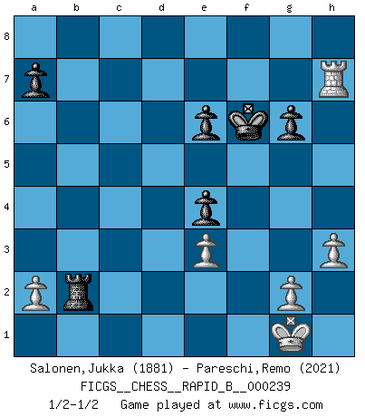 Last move : 1/2-1/2 2016 July 7 6:50:30 [Event "FICGS__CHESS__RAPID_B__000239"] [Site "FICGS"] [Date "2016.03.11"] [Round "1"] [White "Salonen,Jukka"] [Black "Pareschi,Remo"] [Result "1/2-1/2"] [WhiteElo "1881"] [BlackElo "2021"] 1.d4 d5 2.Nf3 Nf6 3.c4 c6 4.e3 g6 5.Nc3 Bg7 6.Bd3 O-O 7.O-O Nbd7 8.cxd5 cxd5 9.Bd2 e5 10.dxe5 Ng4 11.Be2 Ndxe5 12.h3 Nxf3 13.Bxf3 Nf6 14.Ne2 Ne4 15.Bxe4 dxe4 16.Bc3 Qxd1 17.Rfxd1 Be6 18.Bxg7 Kxg7 19.Nf4 Rad8 20.Nxe6+ fxe6 21.Rac1 Kf6 22.Rxd8 Rxd8 23.Rc7 Rd1+ 24.Kh2 Rd2 25.Rxb7 Rxf2 26.Kg1 Rd2 27.Rxh7 Rxb2 1/2-1/2 Queen's pawn game Kingside Castling by player Black (move 6) Kingside Castling by player White (move 7) This chess game ended in a draw. Follow this game move after move (download)If a ruler does not understand Chess, how can he rule over a kingdom ? (King Khusros II) Der vorletzte Fehler gewinnt. (Savielly Grigorievitsch Tartakower) Haz el enroque temprano y seguido. (Rob Sillars) Il vaut toujours mieux jouer un plan faux de façon logique que de n'avoir pas de plan du tout. (Victor Kortchnoï) Mandala - that's it! 16x16 squares as multiple of the four and the eight because of the Four Noble Truths and the Noble Eightfold Path. (Heinz-Georg Lehnhoff about Big Chess)