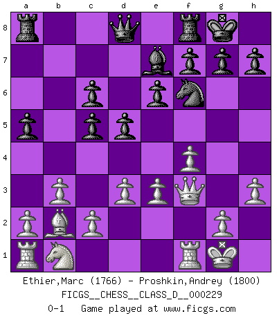 Last move : 0-1 2016 July 23 2:37:57 [Event "FICGS__CHESS__CLASS_D__000229"] [Site "FICGS"] [Date "2016.03.12"] [Round "1"] [White "Ethier,Marc"] [Black "Proshkin,Andrey"] [Result "0-1"] [WhiteElo "1766"] [BlackElo "1800"] 1.f4 d5 2.b3 c5 3.e3 Nc6 4.Nf3 Nf6 5.Bb5 Bg4 6.Bb2 e6 7.Bxc6+ bxc6 8.h3 Bxf3 9.Qxf3 Be7 10.O-O O-O 11.d3 a5 0-1 Bird's Opening Kingside Castling by player White (move 10) Kingside Castling by player Black (move 10) Player Black won this chess game. Follow this game move after move (download)When I asked Fischer why he had not played a certain move in our game, he replied: 'Well, you laughed when I wrote it down !' (Mikhail Tal) Ich glaube nicht an Psychologie, ich glaube an gute Züge. (Robert James Fischer) No es tiempo de jugar al Ajedrez cuando la casa esta en llamas. (Proverbio Italiano) J'ai vu le vaincu d'Echecs jouer des années durant dans l'espoir de la fête de la victoire. Car tu es plus riche de ce qu'elle existe si même elle n'est point pour toi. Ainsi de la perle du fond des mers. (Antoine de Saint-Exupéry) A cynic is a man who knows the price of everything but the value of nothing. (Oscar Wilde)